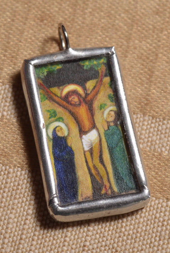We call this the "Tree of Life Crucifixion" because Sue shows the cross as the Tree of Life in the new Garden of Eden. Mary is the new Eve and Jesus is the new Adam, because they obeyed God, unlike the original Adam and Eve. John is the other person under the cross. He stands for us, as Christ gave Mary to him to be his mother and ours.