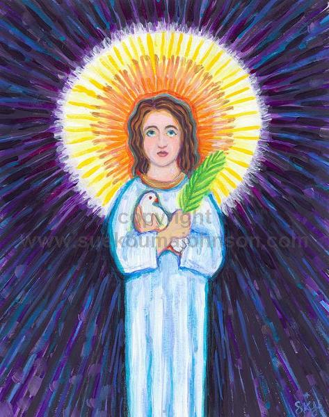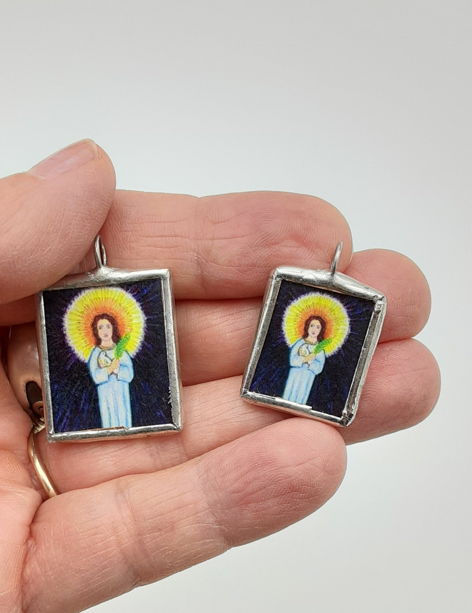 This glass and solder medal is perfect for the Lucy in your life, confirmandi with the patron saint of Lucy, those with eye problems...Sue painted the original image with colored pencils and acrylics. She holds a palm branch, symbol of martyrdom, and a dove for innocence.