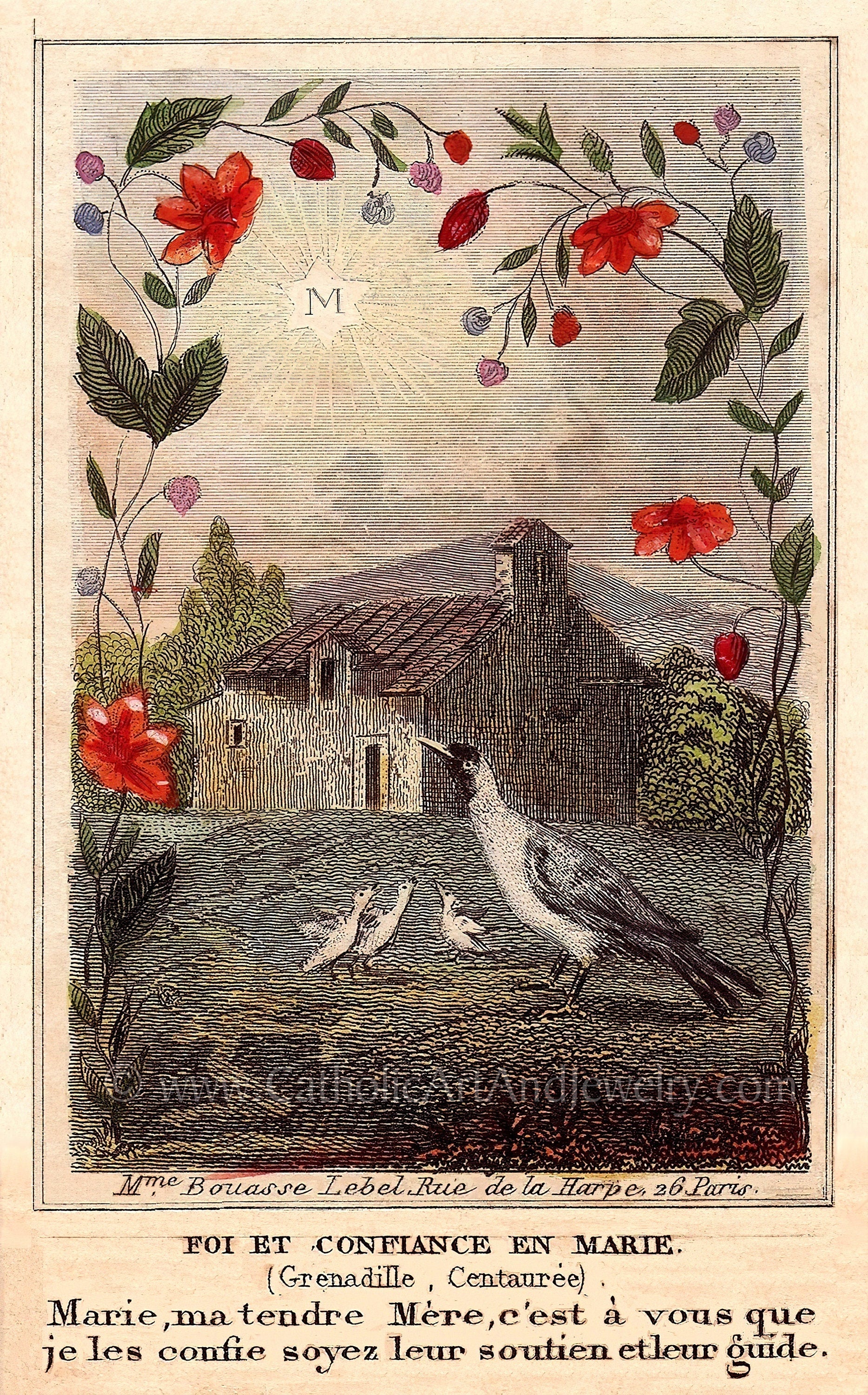 Referring to the children, the French reads, "Faith and trust in Mary. Grenadille, Centauree. Mary, my tender mother, it is to you that I entrust them to be their support and their guide." The two flowers entwined in the border are Grenadille and Centauree, respectively a passion fruit and a thistle, representing the passion and suffering of our Lord, which Mary witnessed and shared.