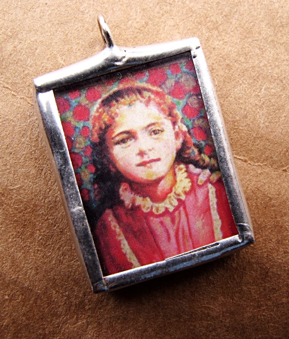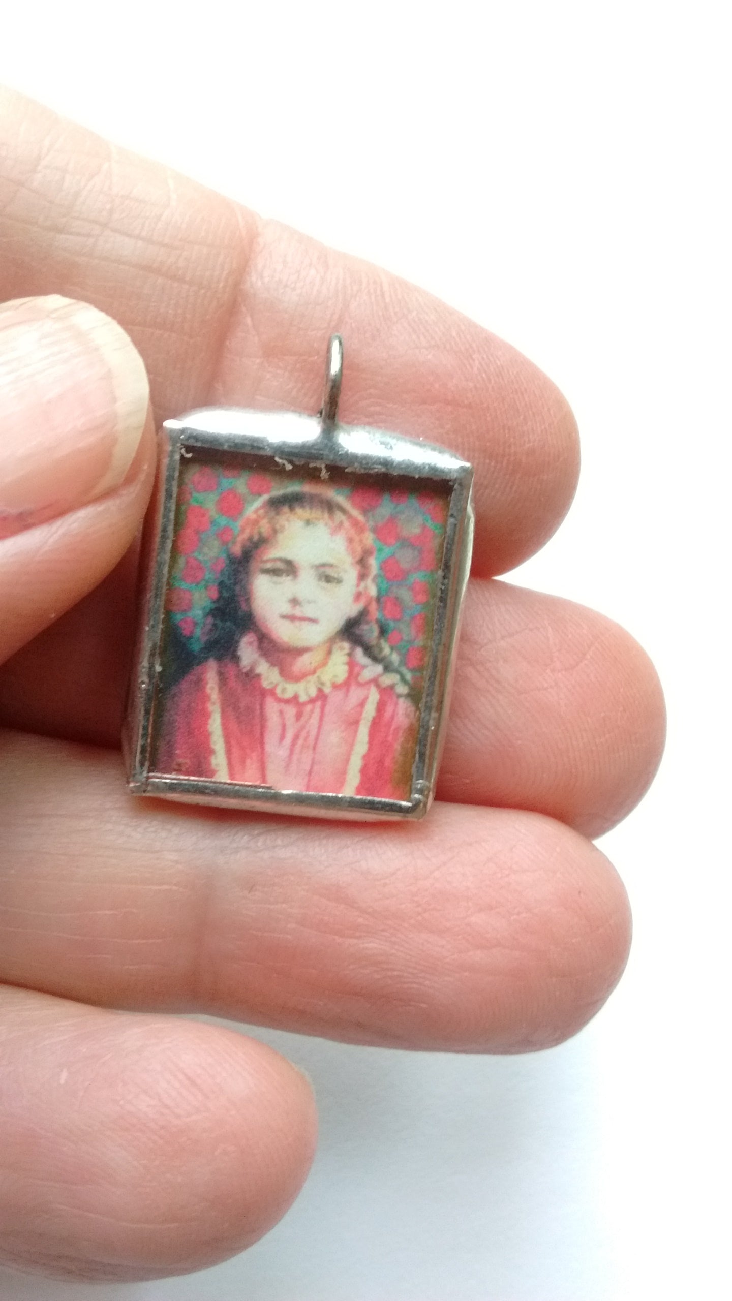This little charm is very sweet for a girl to wear on a chain or ribbon. Saint Theresa is the saint of the Little Way, meaning doing everything with love, no matter how small. Sue Kouma Johnson painted the original of this print from an old photo of the saint which was taken with her sister. Of course, it was in black and white so she spiced it up with some color and roses. It turned out pretty and is great as a medal or pendant.