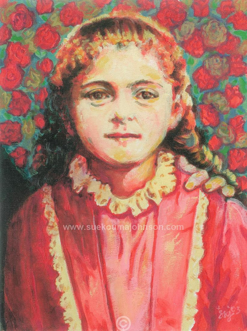 Saint Therese of Lisieux, also known as "the Little Flower," lived and died at the end of the nineteenth century as a girl, really. She was only 24 when she died, as a Carmelite nun. During her last illness she was ordered to write her story, which she called The Story of a Soul. It spells out her simple spirituality, the way of littleness, or spiritual childhood. That is why Sue likes to portray her as a child.