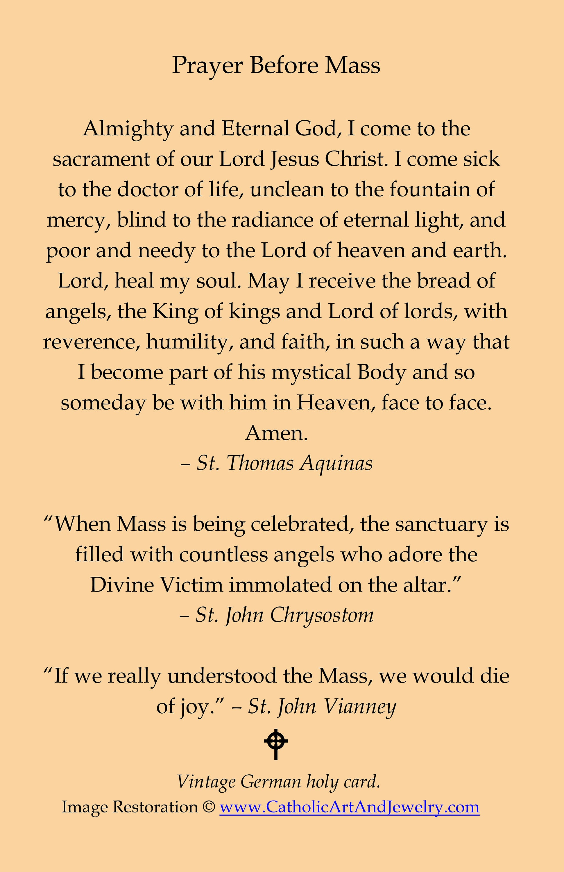 We have a beautiful prayer on the back from St. Thomas Aquinas (see picture) to help prepare for Mass. We also have two quotes, one of them from St. John Chrysostom, who said, "When Mass is being celebrated, the Sanctuary is filled with countless Angels who adore the Divine Victim immolated on the altar."