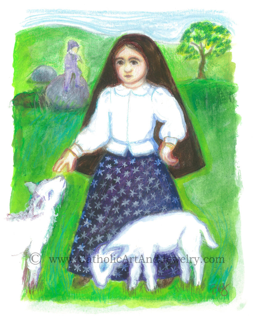 In 1917 Our Mother came from heaven to bring a message to the earth. She chose three humble peasant children in Fatima, Portugal as her messengers, Lucia Santos, and Francisco and Jacinta Marto. This is the artist's rendition of Jacinta, who was only 7 at the time, and had such a loving heart. Francisco is in the background, playing his flute. The two of them died shortly after the visions, and were canonized by the Church in 2017.