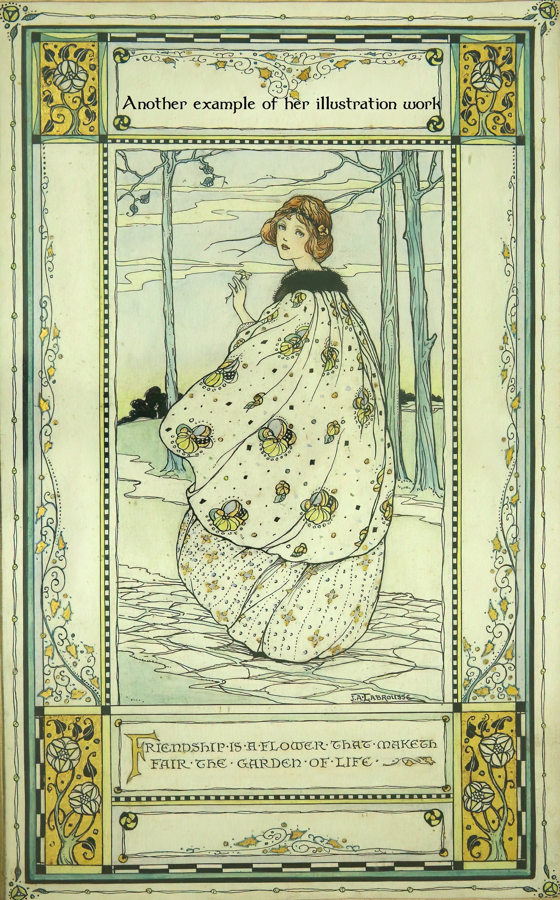 Labrousse studied at Regent Street Polytechnic Institute in London under Harry George Theaker. He taught Art Nouveau and also became a successful book illustrator slightly before she did, so we assume he guided not only her art but also her early business career.