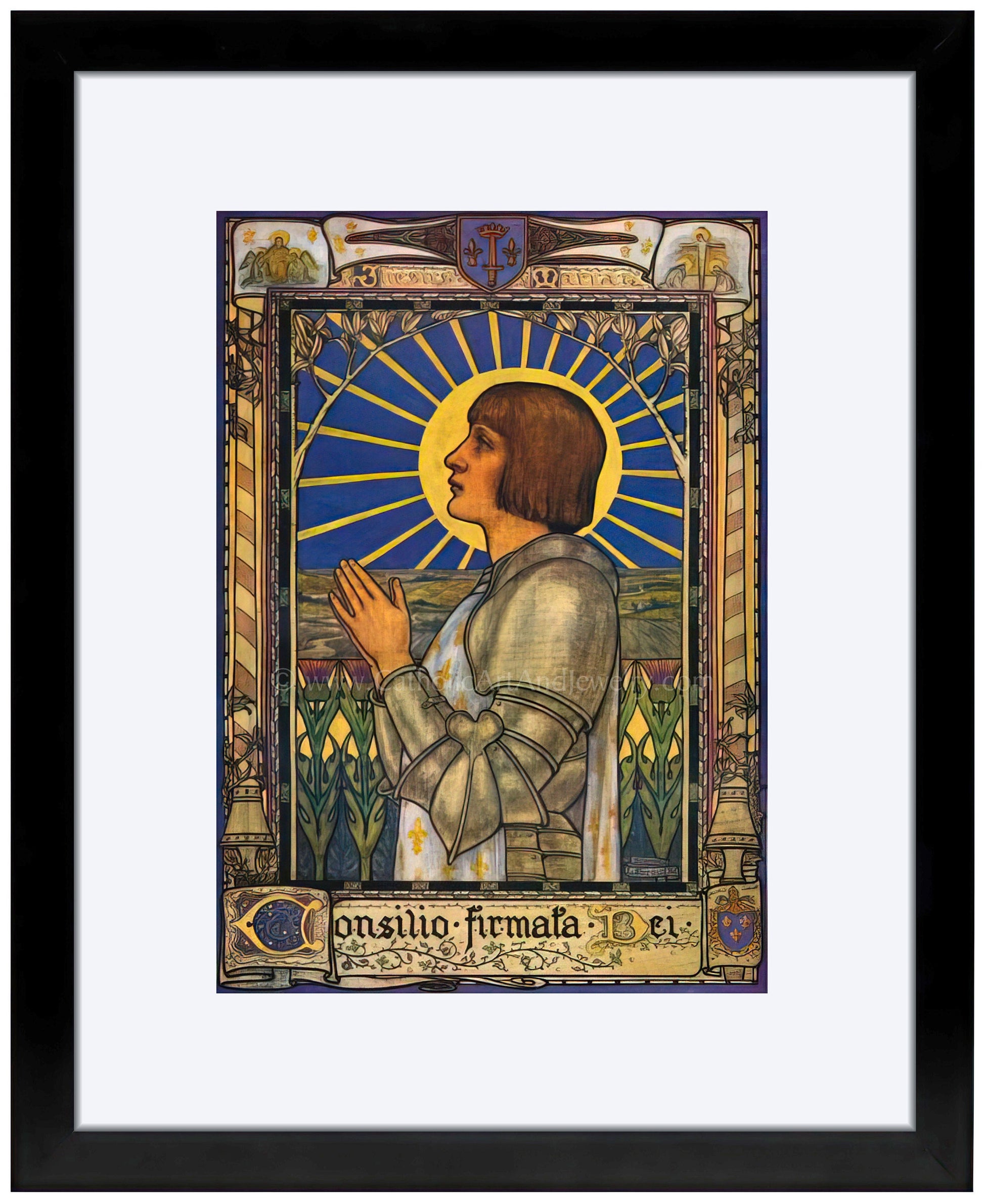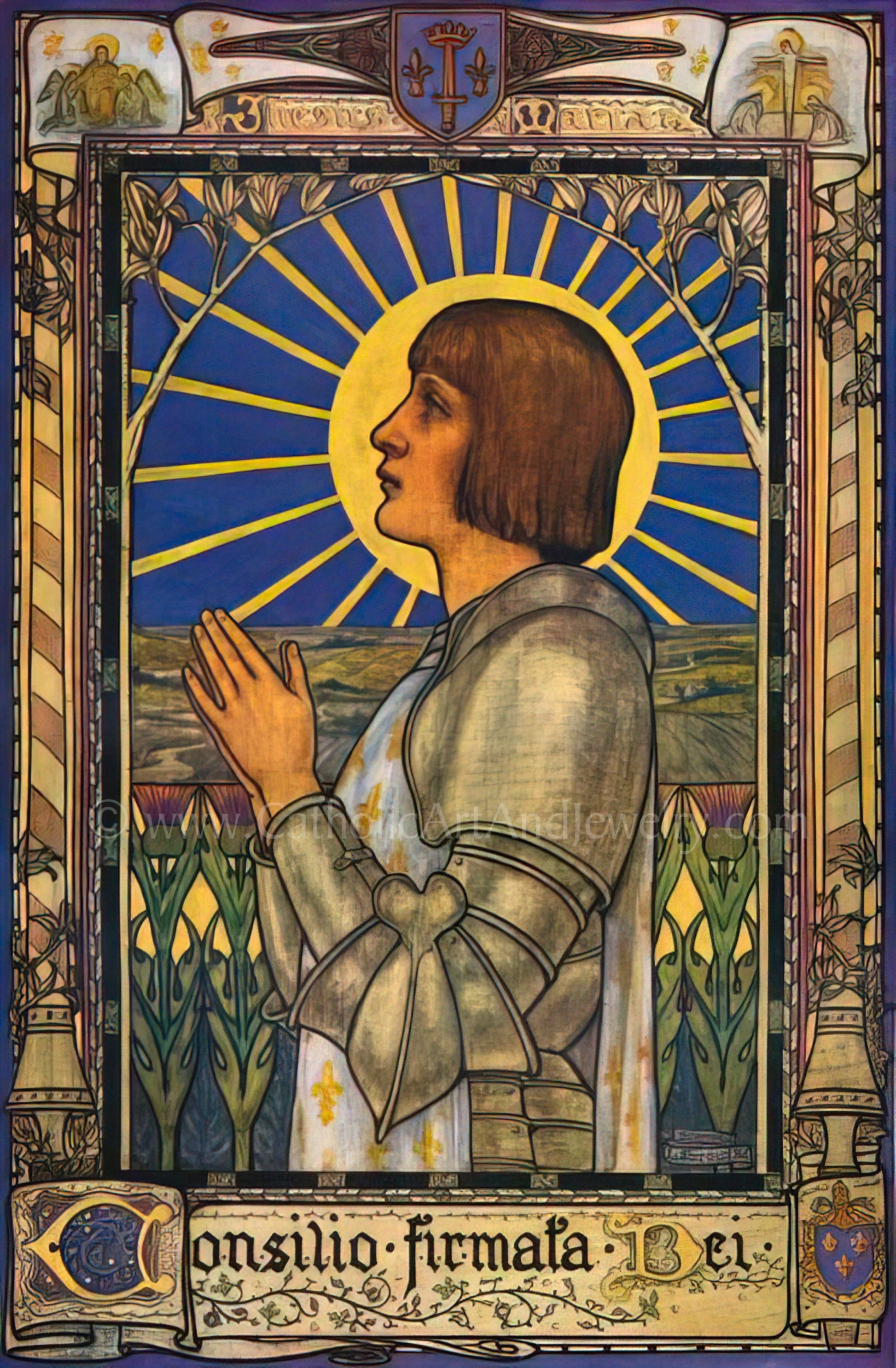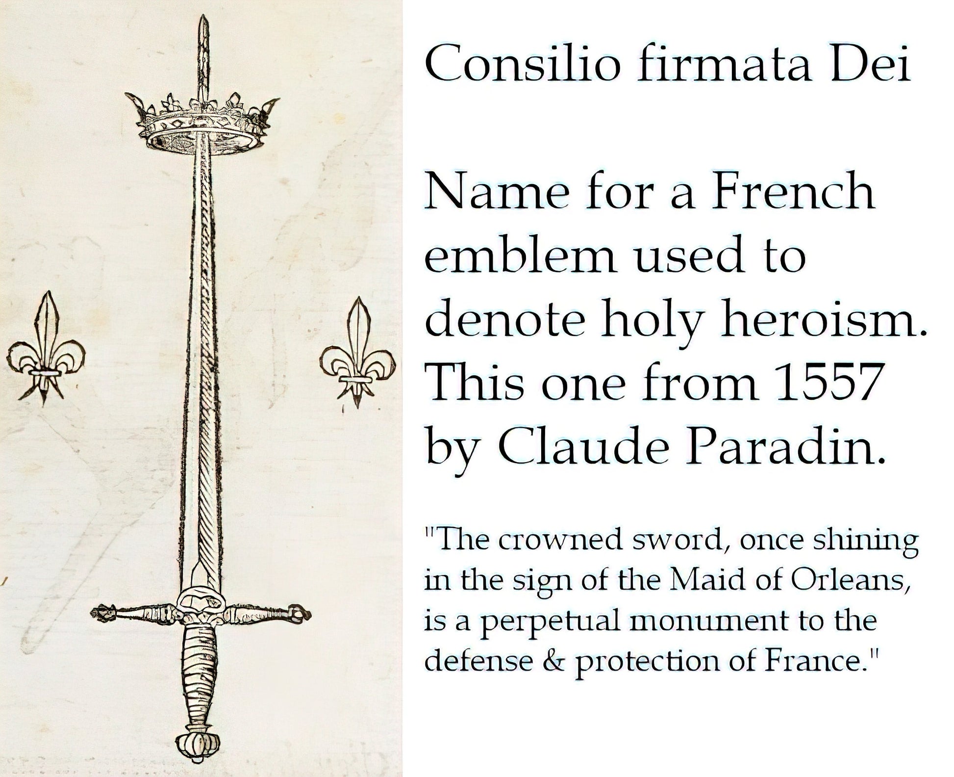 At the top of the picture are the names Jesus and Maria. The words on the bottom part are Latin: Consilio firmata Dei (Council Established by God), which to the French meant an emblem of a sword with a crown sitting around the tip of the blade, which is pointing towards the sky. It referred to Joan of Arc and the defense of France. (See illustration.)