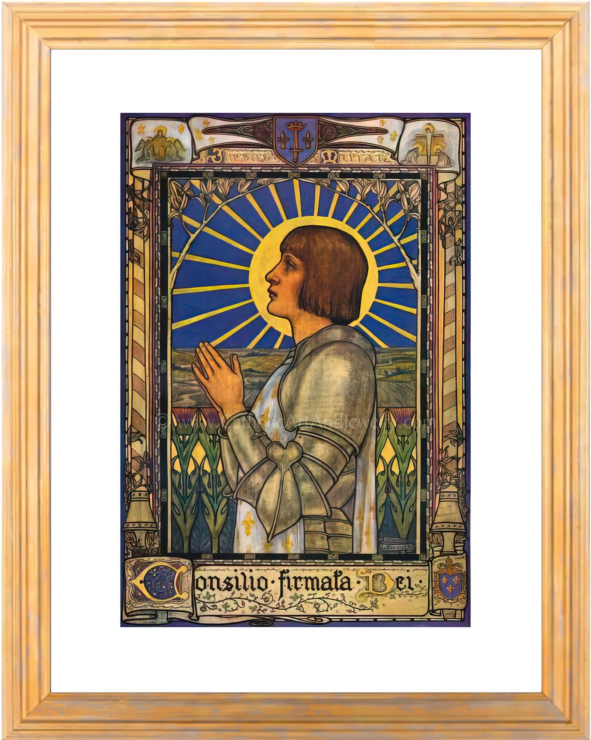 This is perhaps our favorite Joan of Arc paining ever. We love Art Nouveau, and we love Labrousse's colors and details. In French, Joan of Arc is Jeanne d'Arc. Artist Jeanne Antoinette Labrousse painted this about 1918. As with her Madonna and Child painting, it was done in the Art Nouveau style. Known primarily in her day as a pen and ink illustrator for British publications, she also had a long career as a painter and had many shows at the Royal Academy and elsewhere. She had an exquisite and charming style which one reviewer of the day called-in typical English reserve and understatement-a "marked gift."