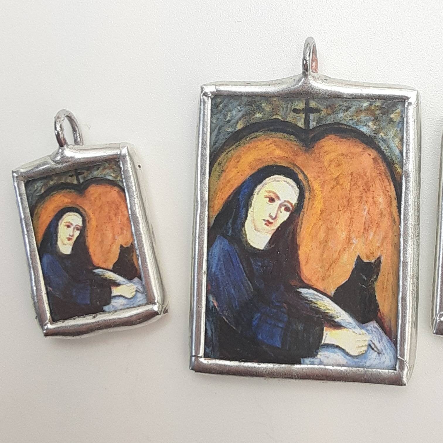 This intriguing, devotional medal is made with two tiny prints of the same image, back to back. The glass is hand cut and soldered with lead-free solder. Part of the charm of handmade items is the slight variation from piece to piece. These are not made in a factory!