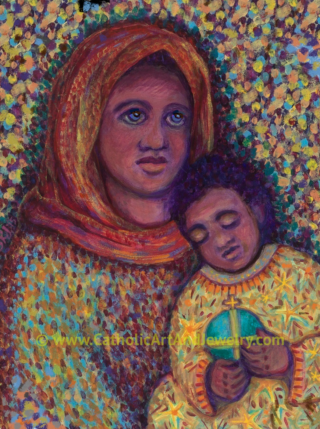 A warm and endearing interpretation of the Blessed Mother with the sleeping Christ Child. He has the whole world in His hands, yet He sleeps? You may be reminded of Christ asleep in the boat, while a great storm was raging. The apostles were fighting for their lives, in sheer terror. Finally, they woke up Jesus, who seemed to not even notice the storm. "Oh ye of little faith," He said, and told the storm to stop. We may feel the Lord is sleeping while we struggle, but He is saying, "Follow My example, and trust in the Heavenly Father."