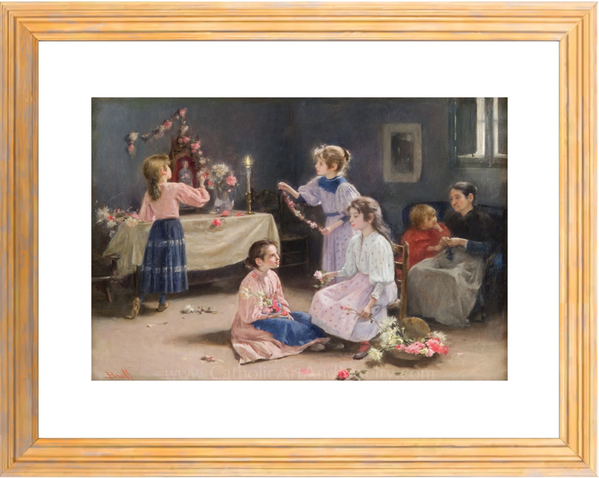 This dear scene illustrates that May is the month of Our Lady. Traditionally Catholics will crown Mary Queen during May. The girls in this picture have gathered flowers and are making garlands to decorate a picture of Mary, making a shrine for her and crowning her Queen of their home.