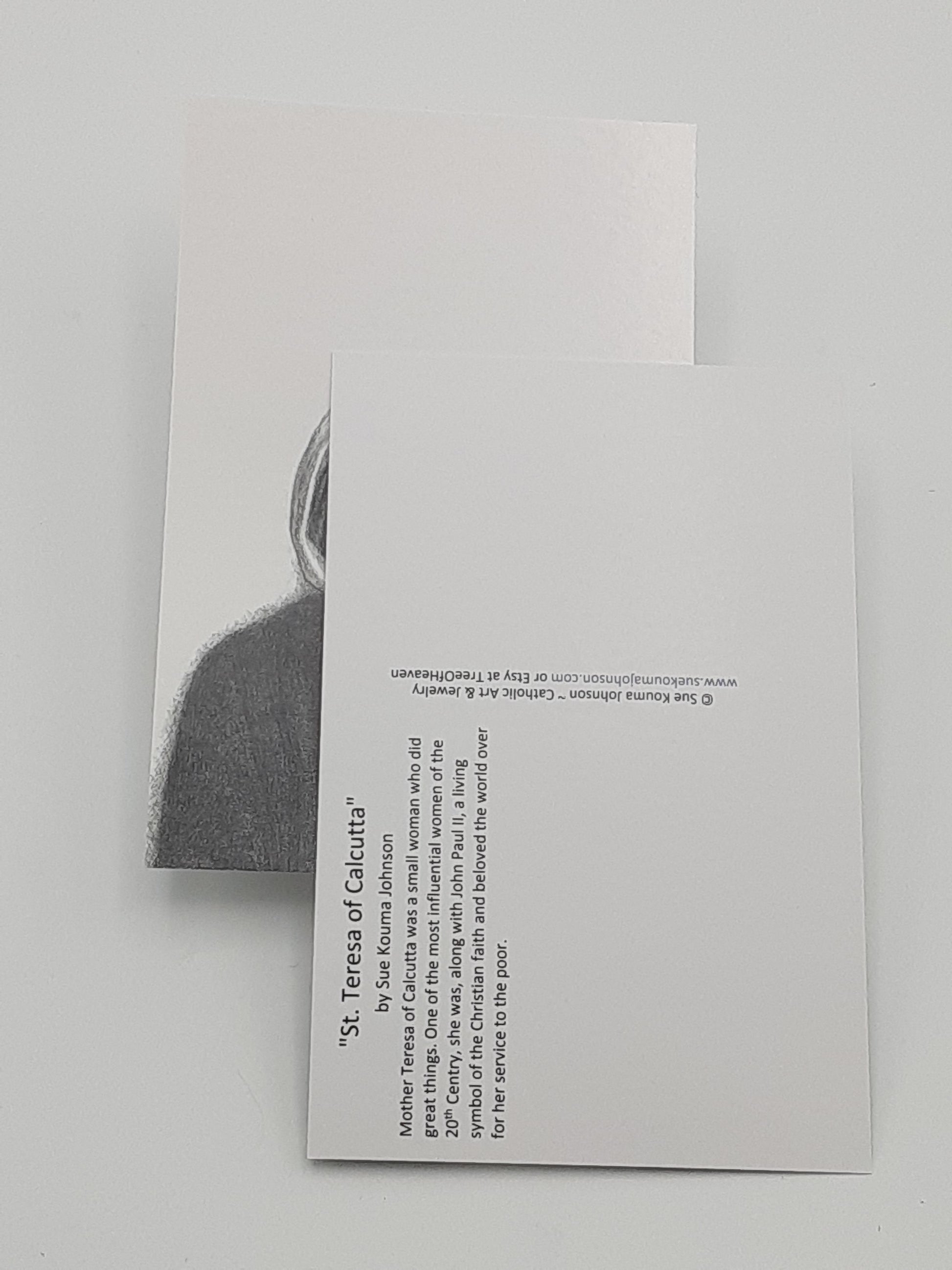 Sue drew this image of Saint Teresa with graphite on paper, and tried to express her littleness. It is well known that she was small of stature, less than 5 feet tall, but she also had a great devotion to her patroness, the Little Flower, St Therese of Lisieux, whose "Little Way" teaches us to be as little children, humble and trusting in our Heavenly Father. Mother Teresa did many small things for the love of Jesus, and so can we!