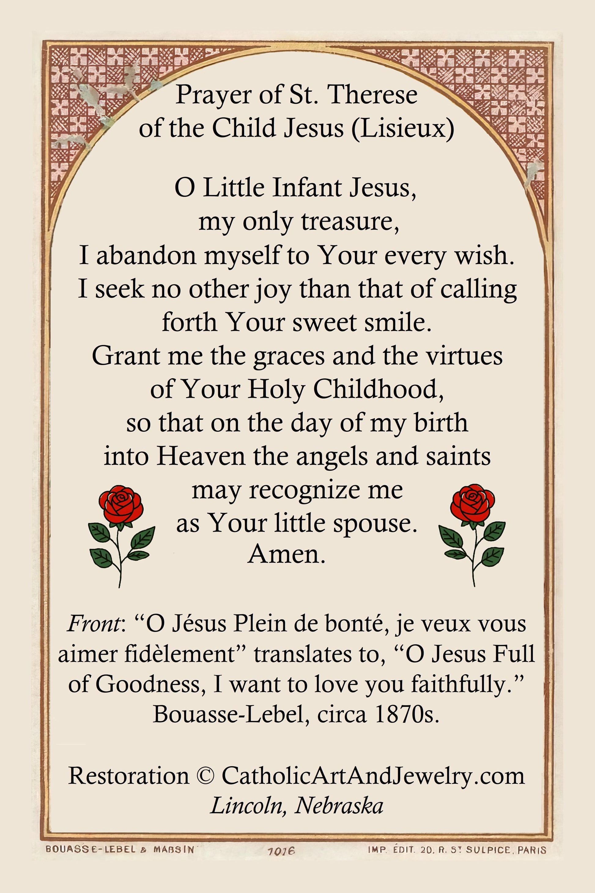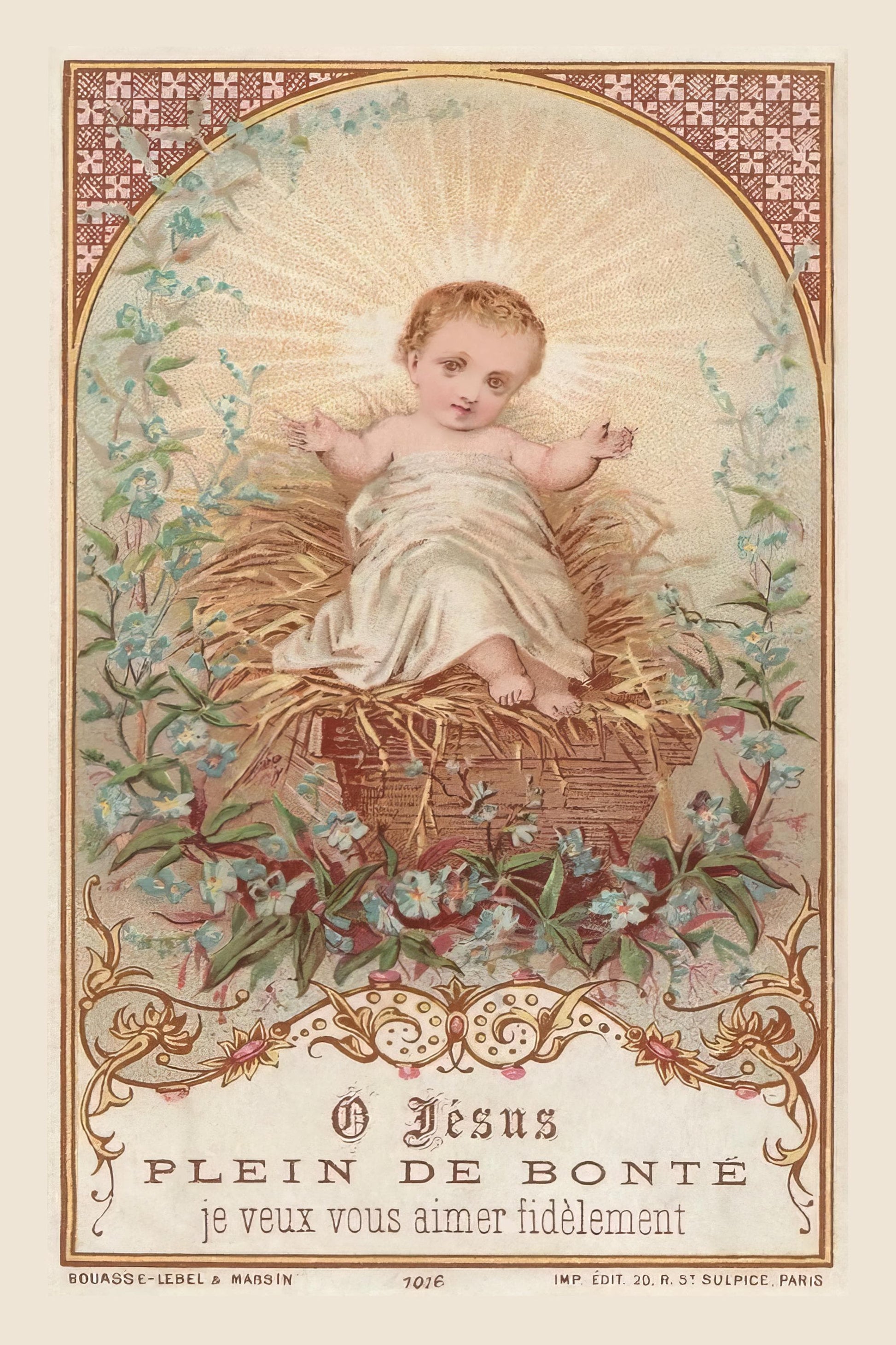 This beautiful, endearing card says on the front, “Oh Jesus, full of goodness, I want to love you faithfully!” It was printed in Paris we think about 1870 or thereabouts. It is very likely that our dear little friend, St. Therese of Lisieux, would have seen it. We know she loved holy cards. With Jesus as a Child, and the talk about Love, we thought this beautiful prayer our little friend wrote would be perfect for Christmas Morning. God bless you all.