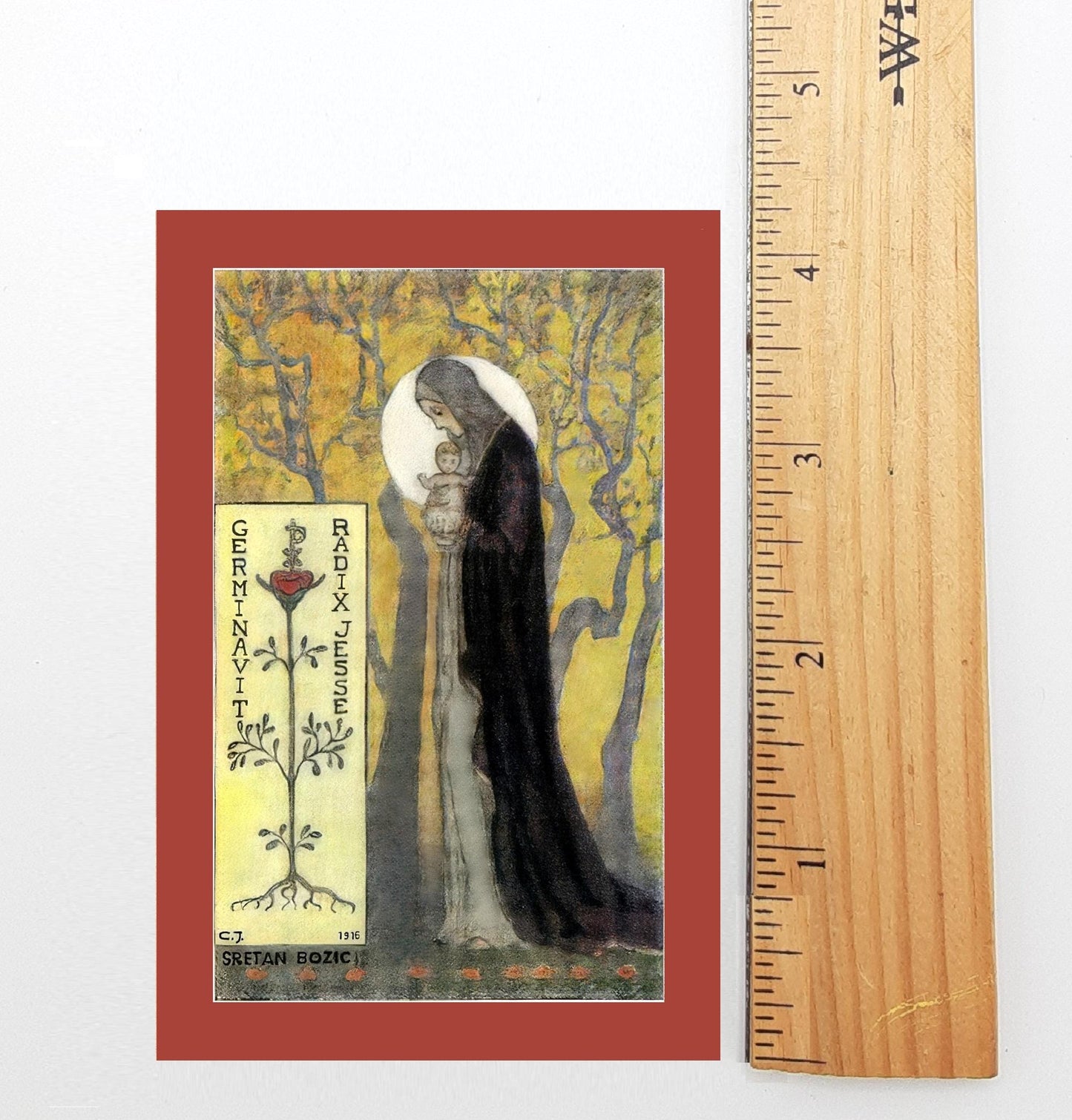 Sporting one of the coolest bits of art on a holy card, this intriguing piece is from Croatia in 1916. The artwork is mysterious and unique. On the front, Sretan Božić means Merry Christmas in Croation, Croatia being a mostly Catholic country, formerly a province of the Austria-Hungary Empire, also mostly Catholic. Germinavit Radix Jesse means "The Root of Jesse has blossomed." It refers to Isaiah 11:10. The prayer on the back is a traditional Advent prayer.