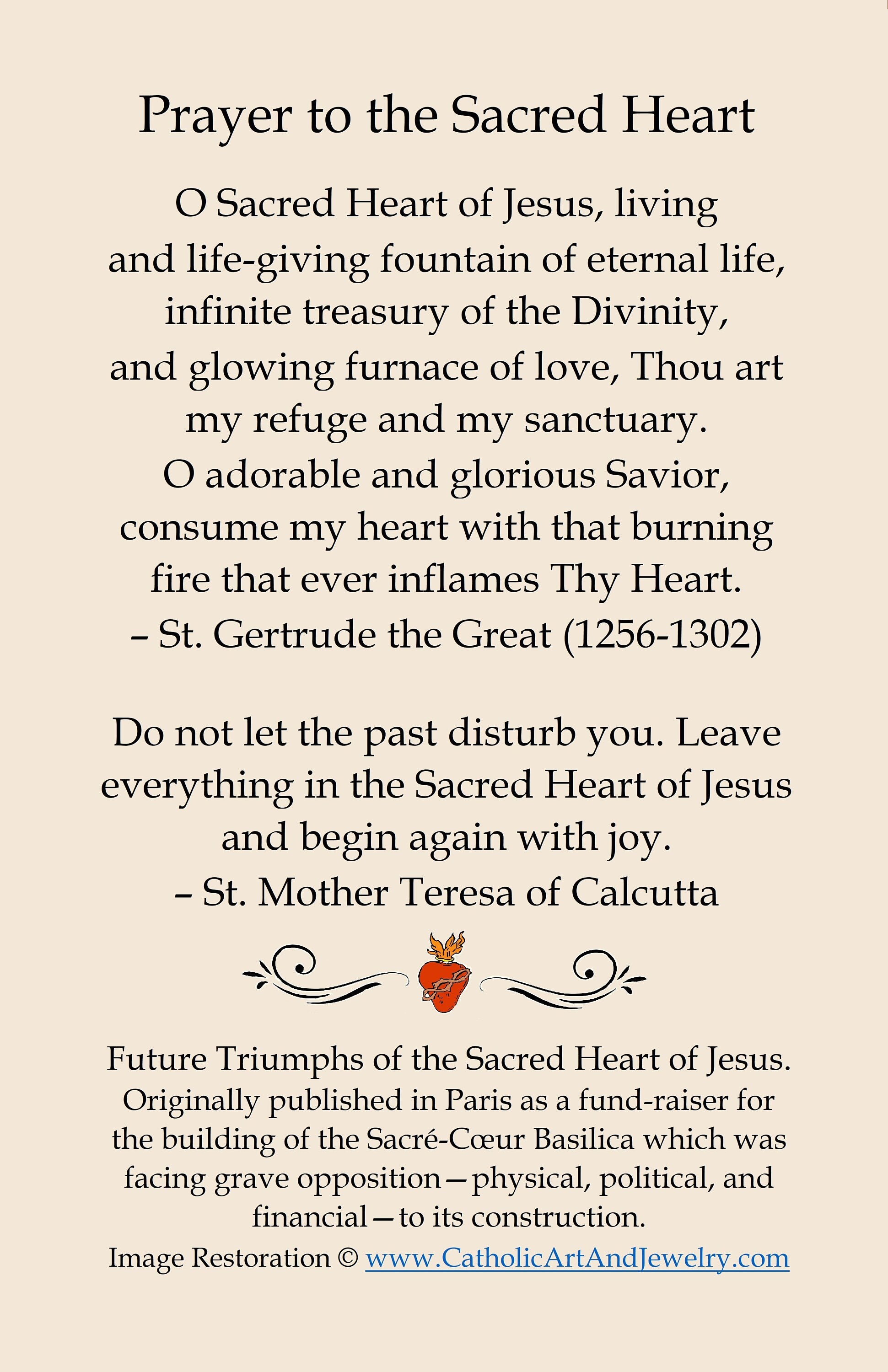 On the back, we have a lovely prayer to the Sacred Heart by St. Gertrude the Great, and a quote from St. Mother Teresa of Calcutta about the Sacred Heart and the future.