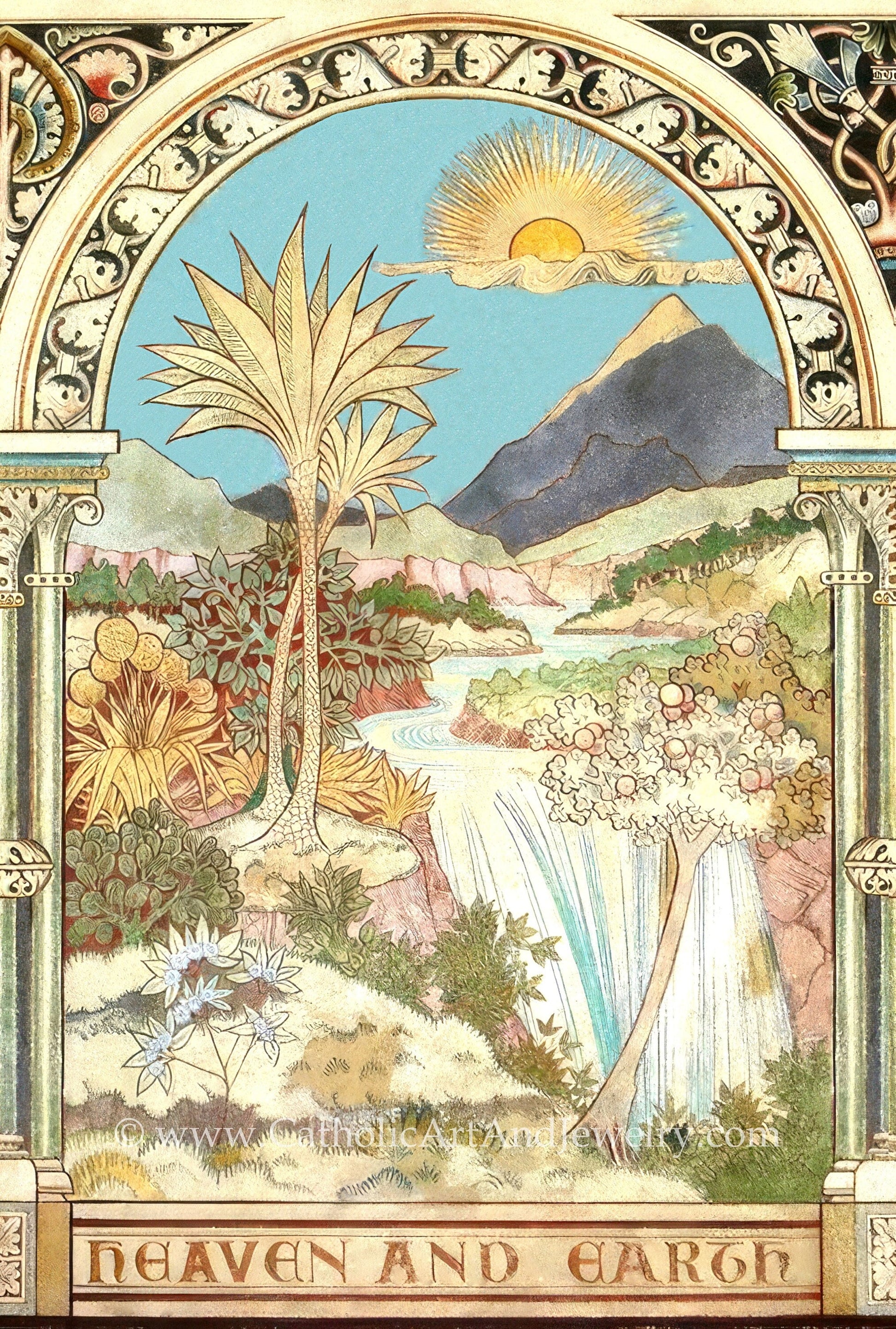 This beautiful piece is part of a larger mural illustrating Bible stories and emphasizing that God is the Creator of all things in Heaven and Earth. The first one, which we carry elsewhere in our shop, admonishes the view to "Worship Him Who Made" and this is the next one in the series, telling us he made "Heaven and Earth." God's sparkling creation, an immense thing of wonder and beauty.