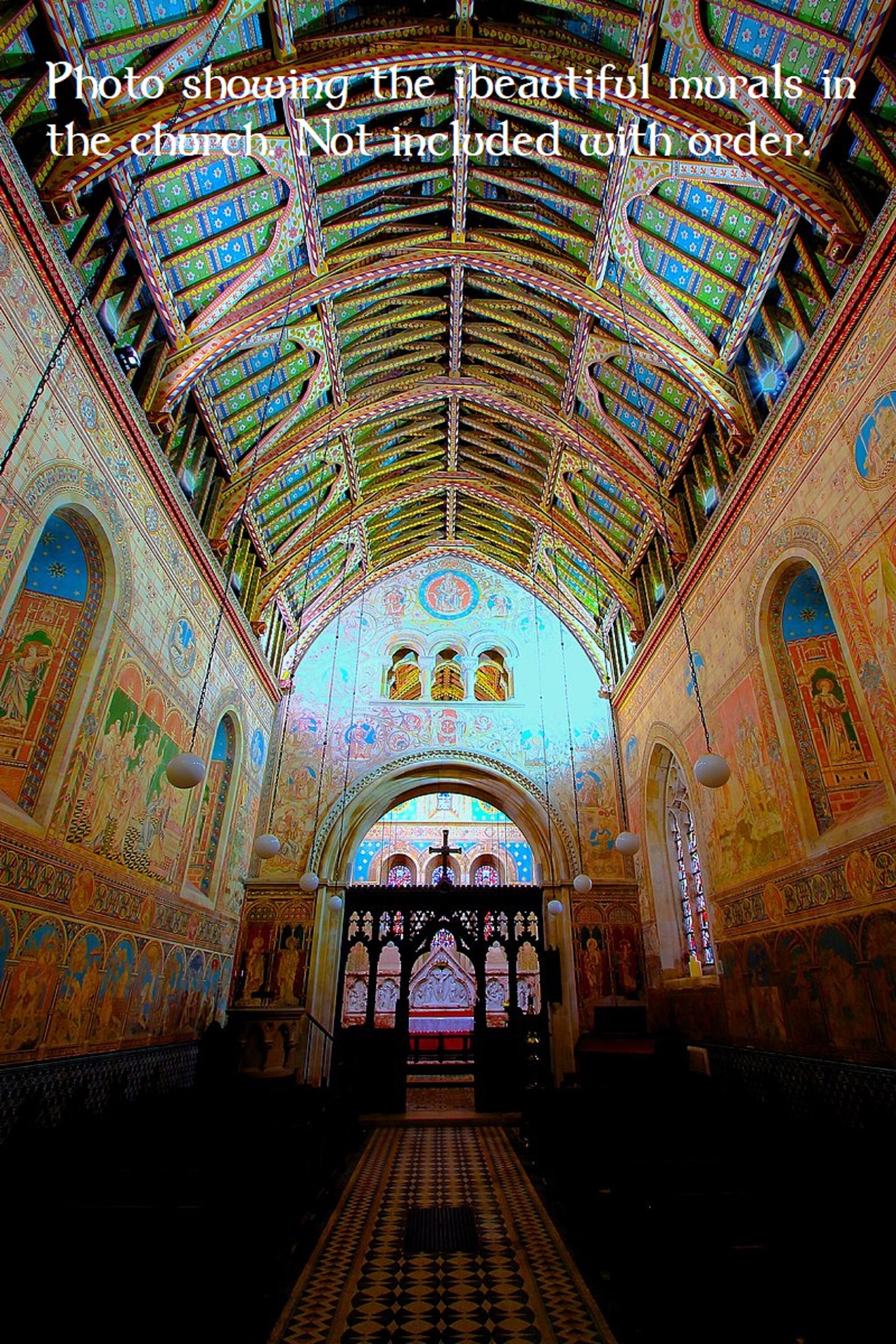The mural is from St. Michael and All the Angels Church of East Yorkshire. The church was originally built about 1132 A.D., but by the 19th Century it was in need of considerable repairs and refurnishing. The firm of Clayton and Bell, primarily known for their stained glass, were hired to do the murals. We don't know if this particular style had a name, but it is visibly part of that river of Western art that flows from Romanticism through Pre-Raphaelite and Art Nouveau to 60s art and Peter Max. We think it's beautiful. Enjoy!