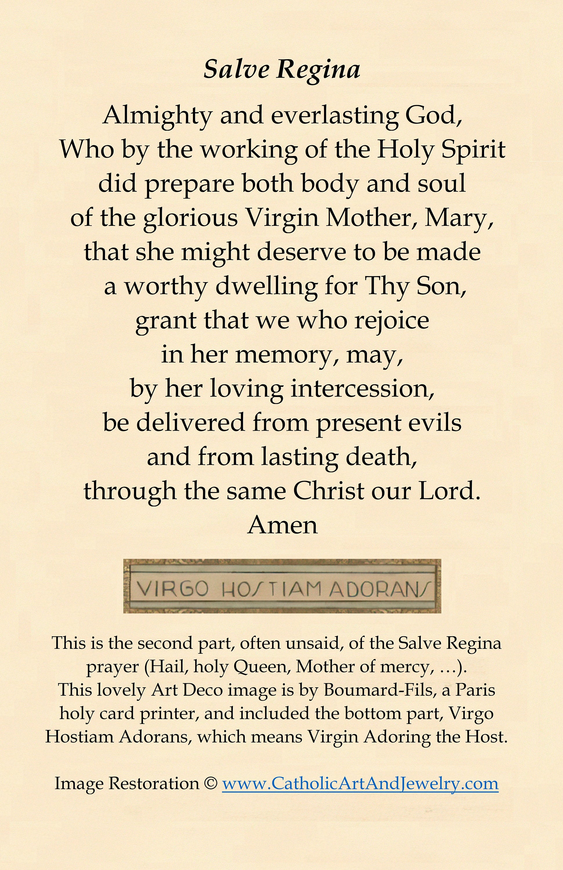 Salve Regina means Hail, Queen [of Heaven]. Virgo Hostiam Adorans means, Virgin Adoring the Host.
