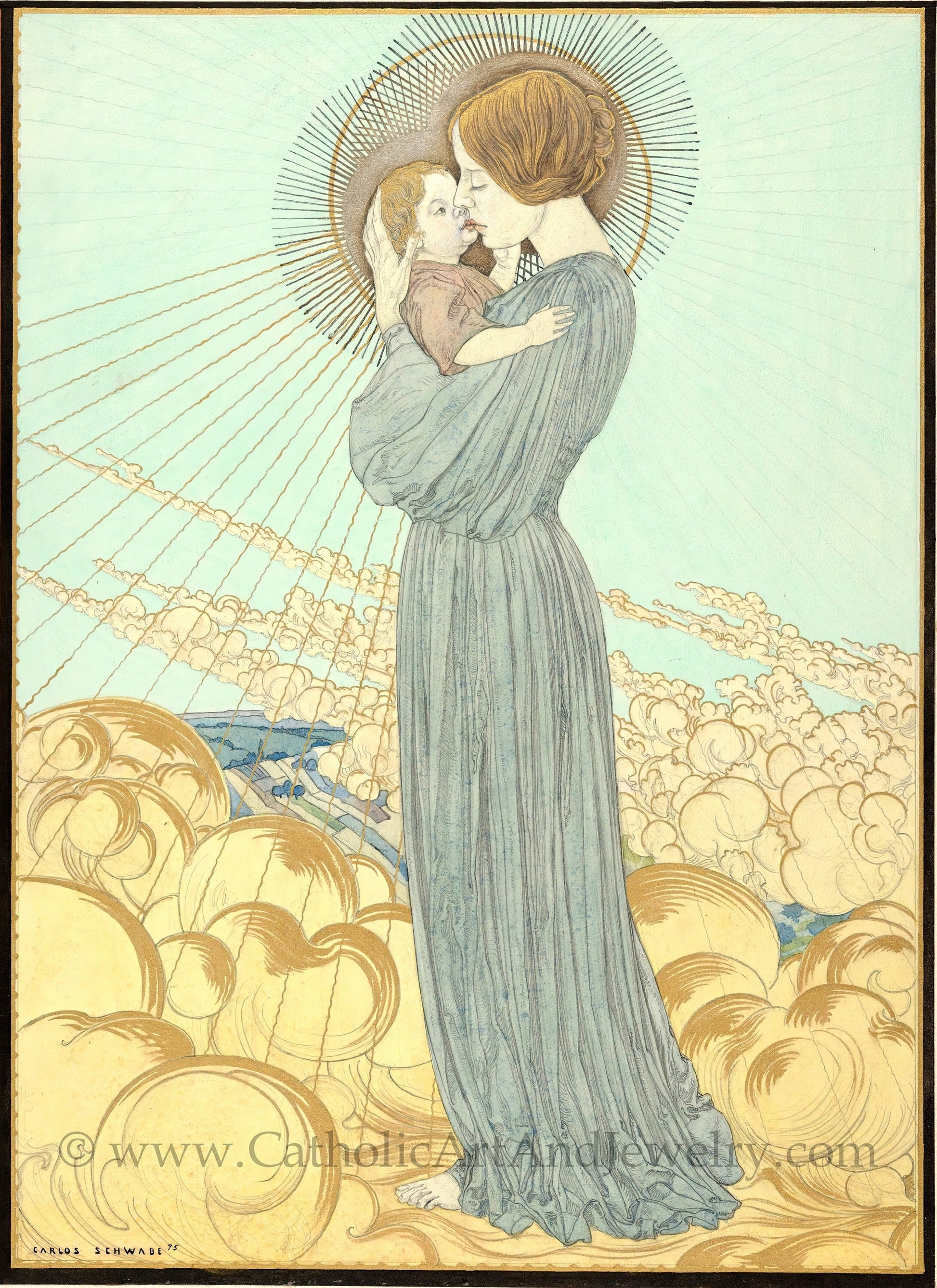 It was a cover design by Carlos Schwabe (1866-1926) for an illustrated book on Jesus. Schwabe was a German artist who had come to Paris, the center of the art world at that time. The painting is Art Nouveau, one of our favorite styles. We always have our eye out for a Catholic piece of Art Nouveau art, as they are rare. They still seem fresh to us.