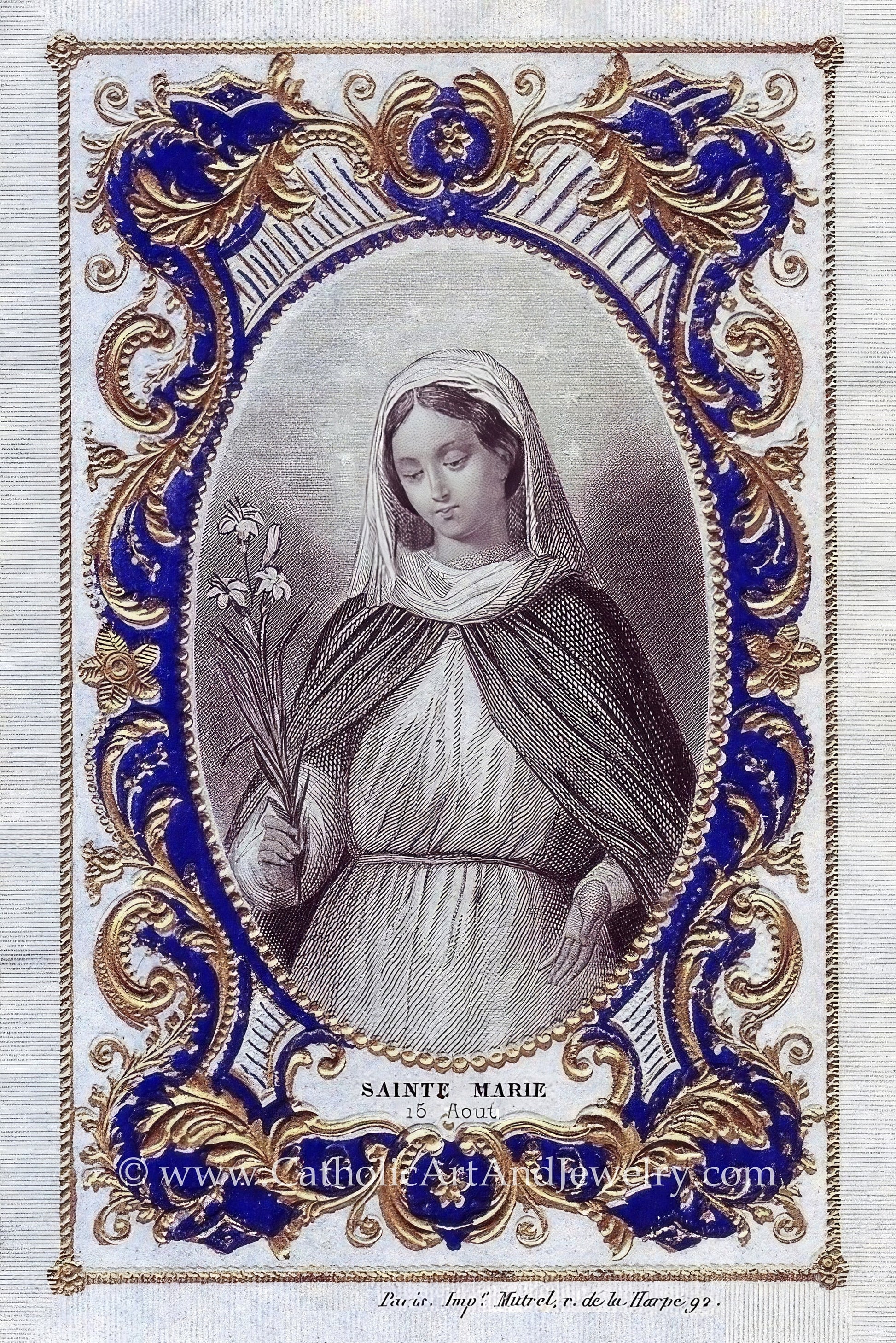 This beautiful vintage holy card art is of an engraving of Mary. It was done in the early to mid 1800s and features an ornate, baroque gold-leaf framing around Saint Marie, with blue hand-colored in around the gold. We think it was from the first few decades of the 1800s, before lithographs took over the printing industry. It was published (imp.) in Paris. We got excited when we saw the number 92 in the line at the bottom, hoping it was 1792, but looking closer, it is an addres, Rue de la Harpe 92, which was an address in the French Quarter in Paris. The publisher, Mutrel, is someone we've never seen before, but if you'd gone to that address back 150 or 200 years ago, you would have found him there and could have bought some more of these.