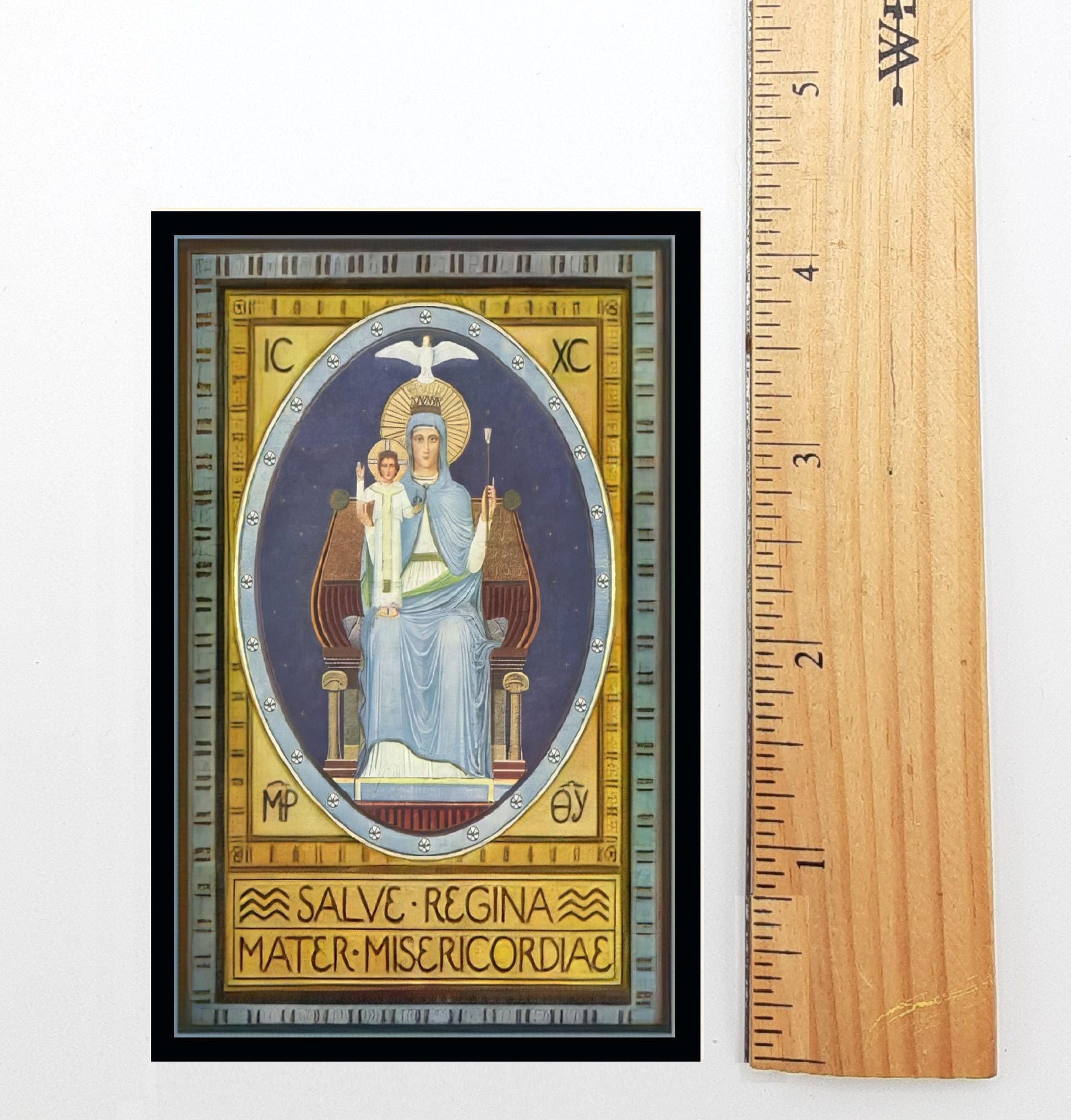 Going out to you TradCats out there, this Salve Regina has the prayer on the back in Latin! The art is from the Benedictine monks from Beuron, Germany, circa 1900. It is a more rigorous Catholic art than the lovely but looser French art for our English version of the Hail Holy Queen holy card we offer.