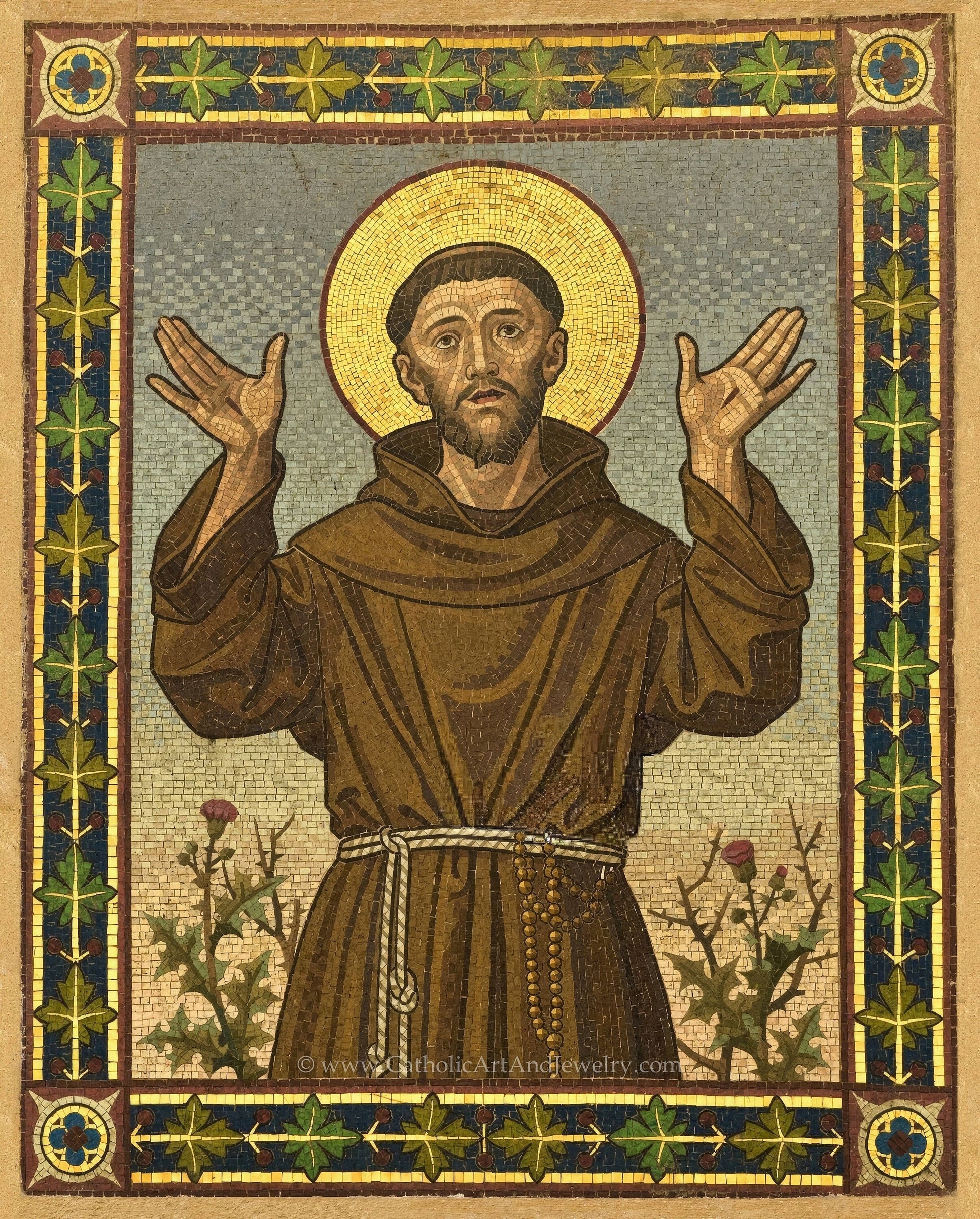 Holy hands upraised in praising our Lord, that's how this lovely mosaic portrays St. Francis. The iconic brown robe, the tonsured head, the golden halo of one of the holiest men ever in the Church. He has a big rosary tucked into his rope belt, and to his side are the roses he would throw himself into when he faced temptation. On his hands are the wounds of Christ, the stigmata that Christ gave him.