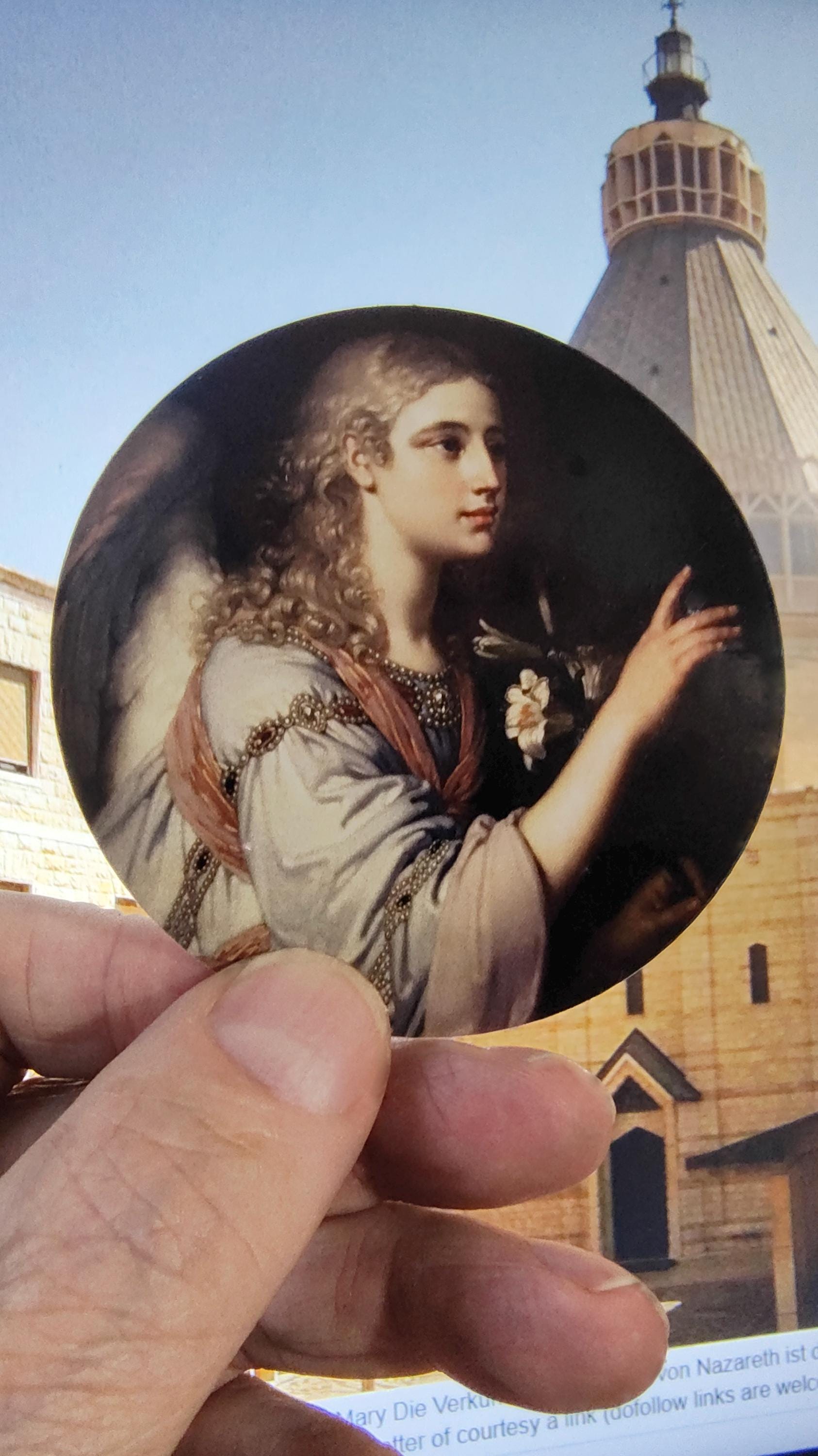 For the background of the pictures, we used a screen shot of The Church of the Annunciation in Nazareth, Israel, the traditional place where the Anuunciation took place.