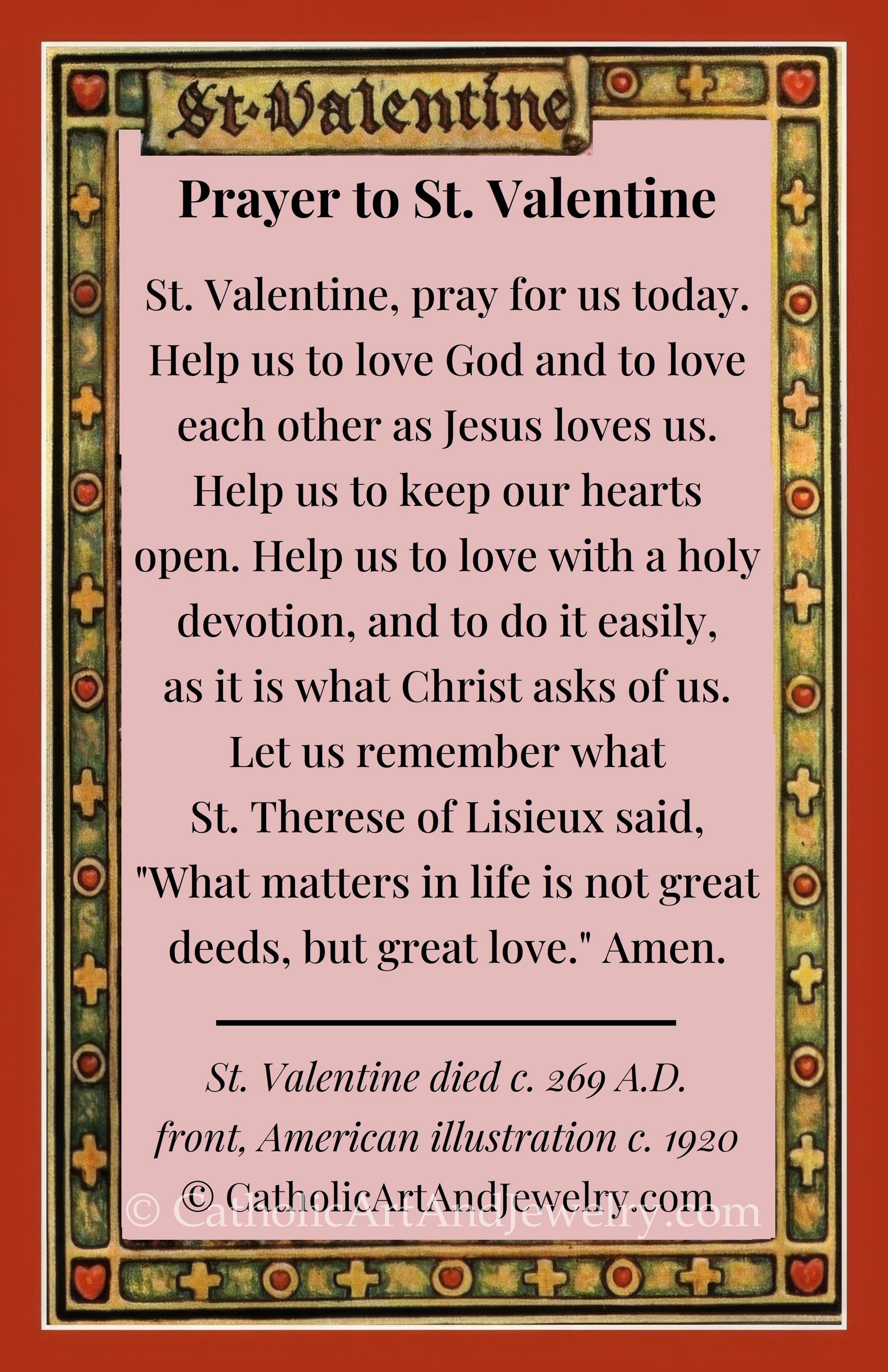 This beautiful holy card has a vintage picture of St. Valentine on the front, and on the back, it has a lovely prayer which will help anyone be more oriented towards love, especially Christian love. Christianity is the religion of love, and people don't know that. Our God says to love him and to love each other, and that's the main thing for us as Christians. You can hand these out to people and tell them that.