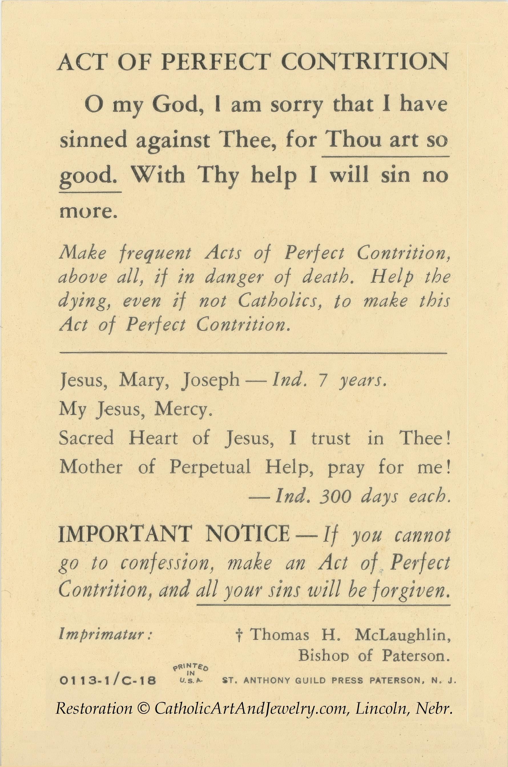 This prayer is very important. It is true for anyone, anywhere. I've witnessed to two people near to their death, and the Holy Spirit inspired me to tell them the main thing God wanted was for them to be sorry for their sins. Are you sorry for your sins? I asked them, and they said yes. I hope to see them at the Resurrection. If there is no priest there, you can act rightfully for the salvation of a soul by doing something like the bishop says to do on this holy card. Like the Good Thief on the cross, being sorry for your sins implies you know God is your maker, and you have sinned before him, and you are in need of his forgiveness. A lot of theology is packed into being sorry before God.
