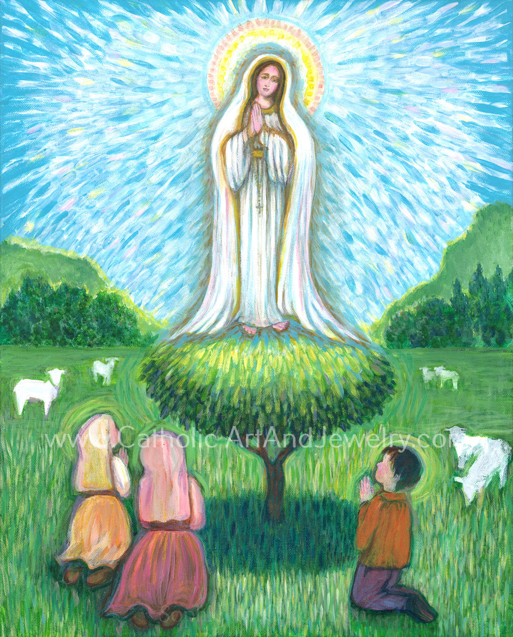 This bright little image is Sue's attempt to portray the sweetness of the setting and characters involved in the apparitions of Our Lady at Fatima. The short, colorful brushstrokes of the landscape and the children's garb contrast with the smooth strokes and soft grays and white of Our Lady's gown. The sky and little holmoak tree are lit up by the brilliance of Mary's presence. The space between the children allows you to enter into the painting and pray with the little seers.