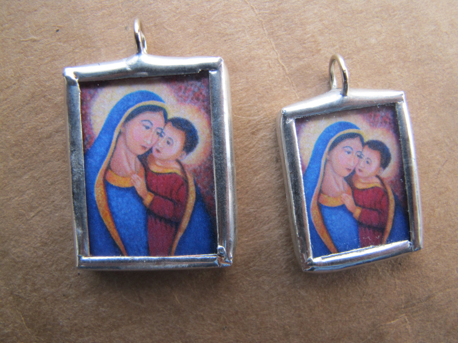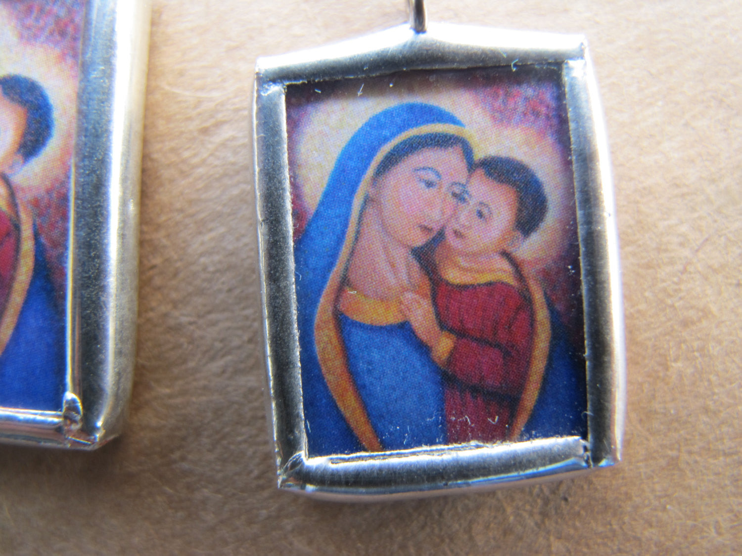 This is an image which Sue Kouma Johnson painted of Our Lady of Good Counsel in acrylics on paper. She was striving for a more Middle Eastern ethnicity in the painting of the closeness of Mary to Christ and to us.