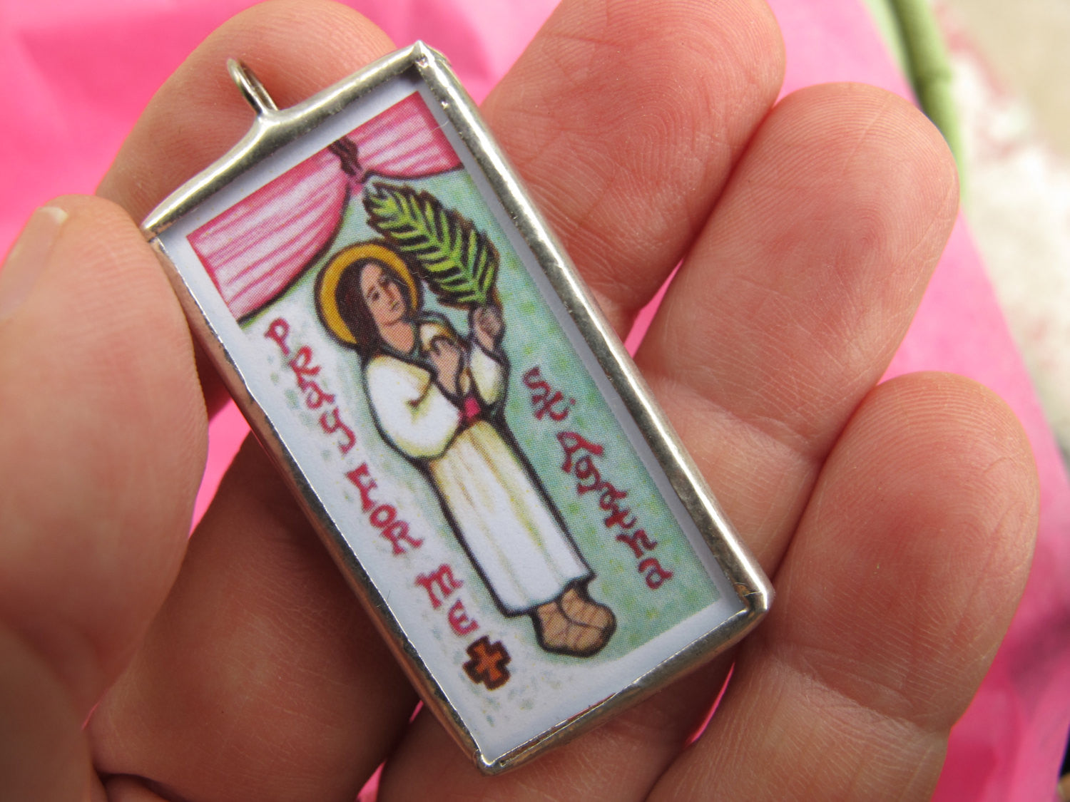 I painted the original image with colored pencils and acrylics. She holds a palm branch, symbol of martyrdom, and a volcano is in the background.