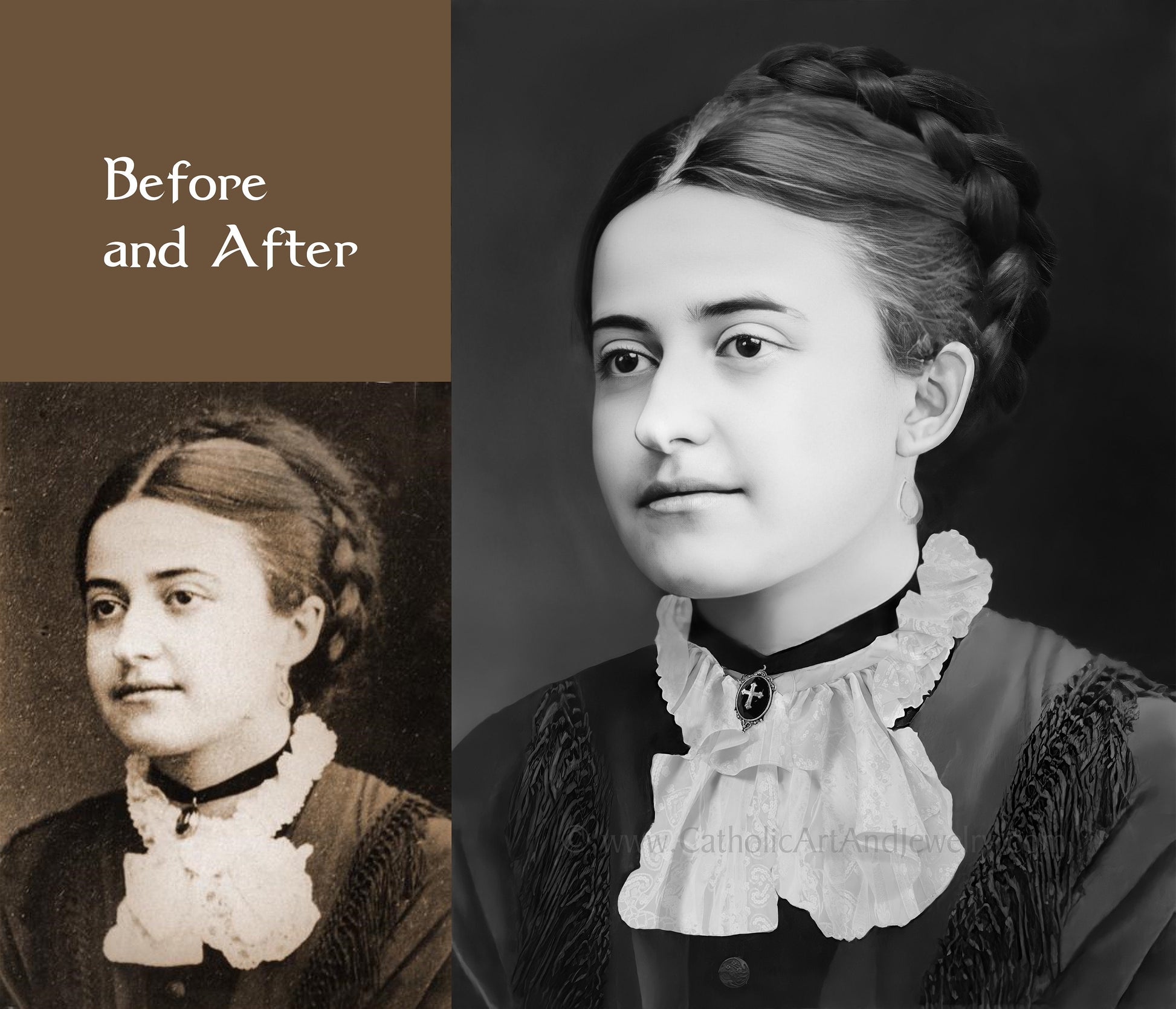 This picture was taken shortly before Pauline entered the Carmel. We find the entire Martin family to be charming and devout, and we have no doubt that they are all in Heaven and will likely all be canonized someday. We hope our restored photo lets you draw nearer to Pauline and her family, and thus closer to our Lord and friend Jesus. (source: archives-carmel-lisieux.fr)