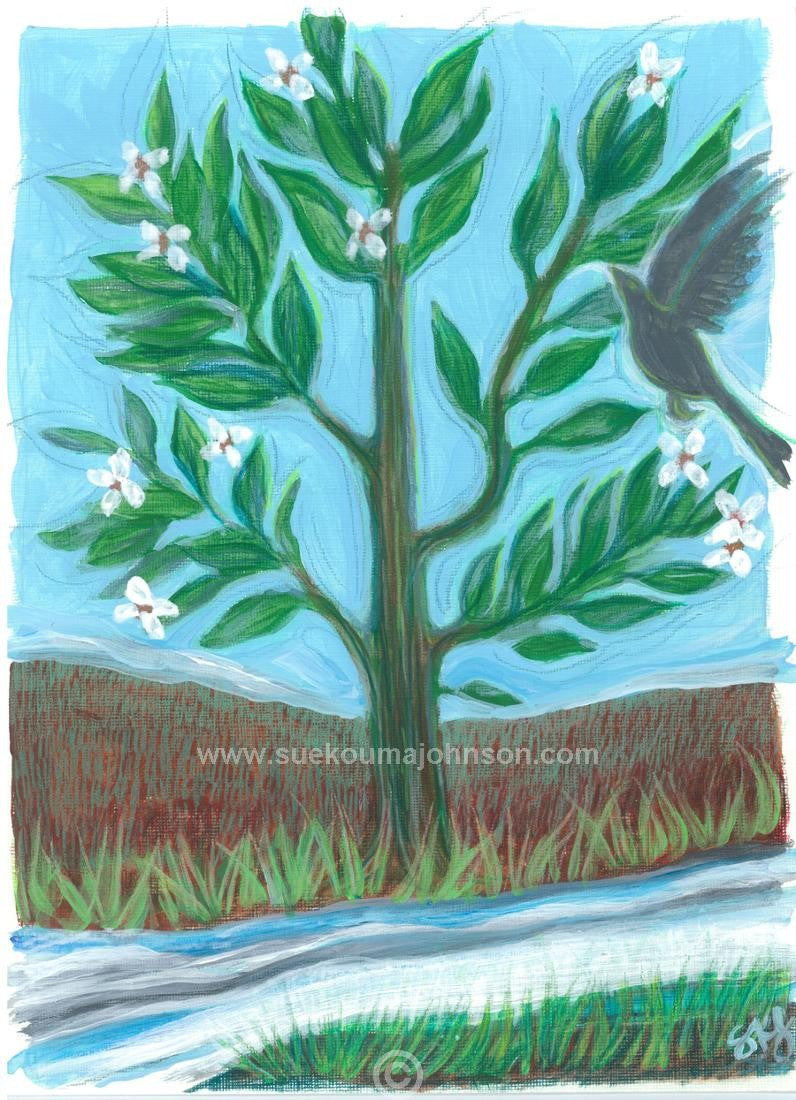 The tree of life planted near running waters is an ancient JudeoChristian symbol. This print is from an acrylic/colored pencil painting on paper.