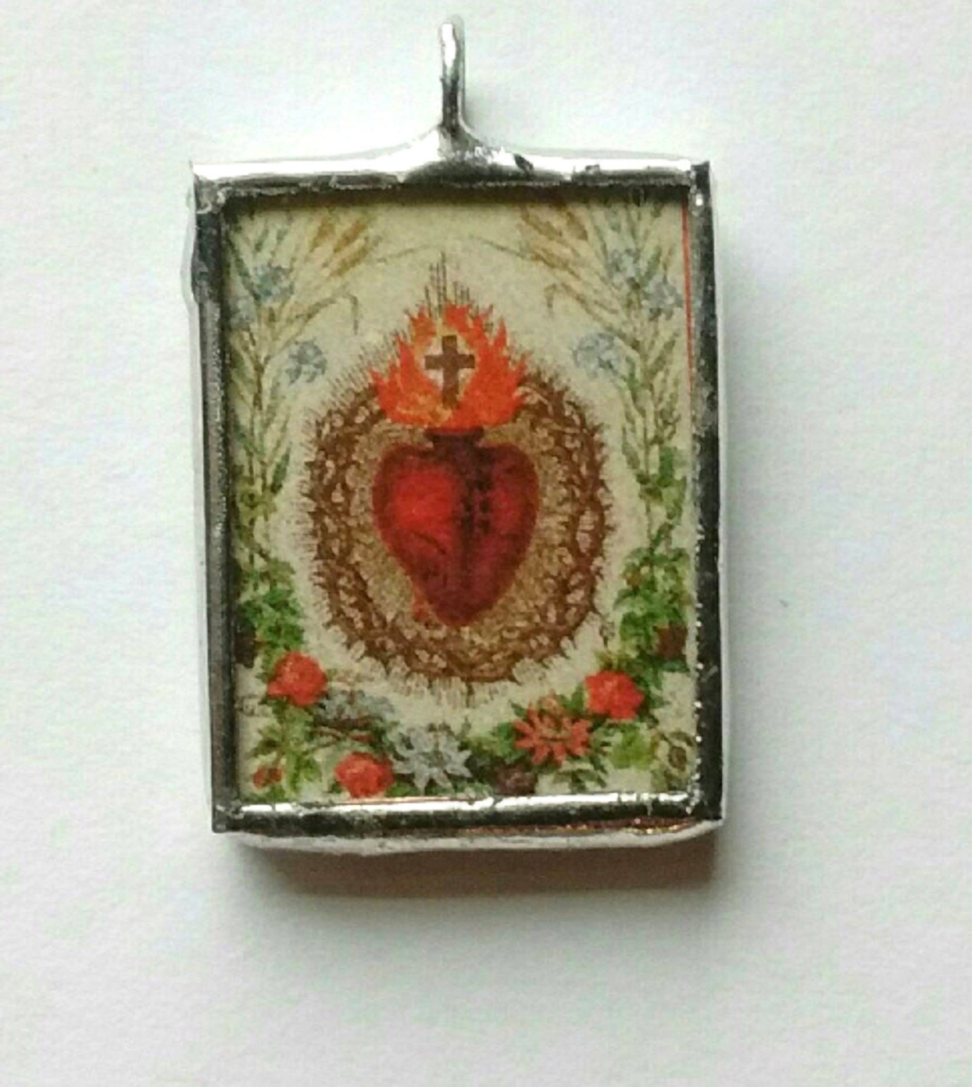 This is a beautiful Sacred Heart glass and solder medal which can be worn as a pendant for adults or even young children. It is a unique holy medal which are usually stamped metal. Handmade by me using lead-free solder.