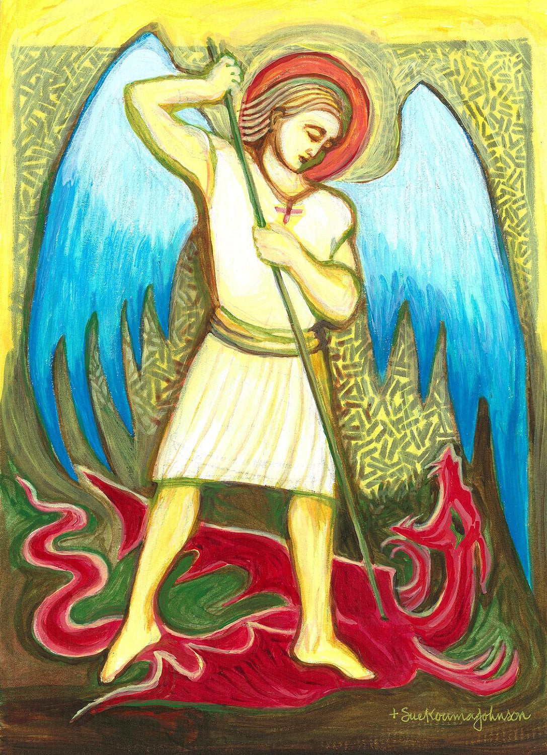 Sue painted this image with acrylics and colored pencils on a mat board.
