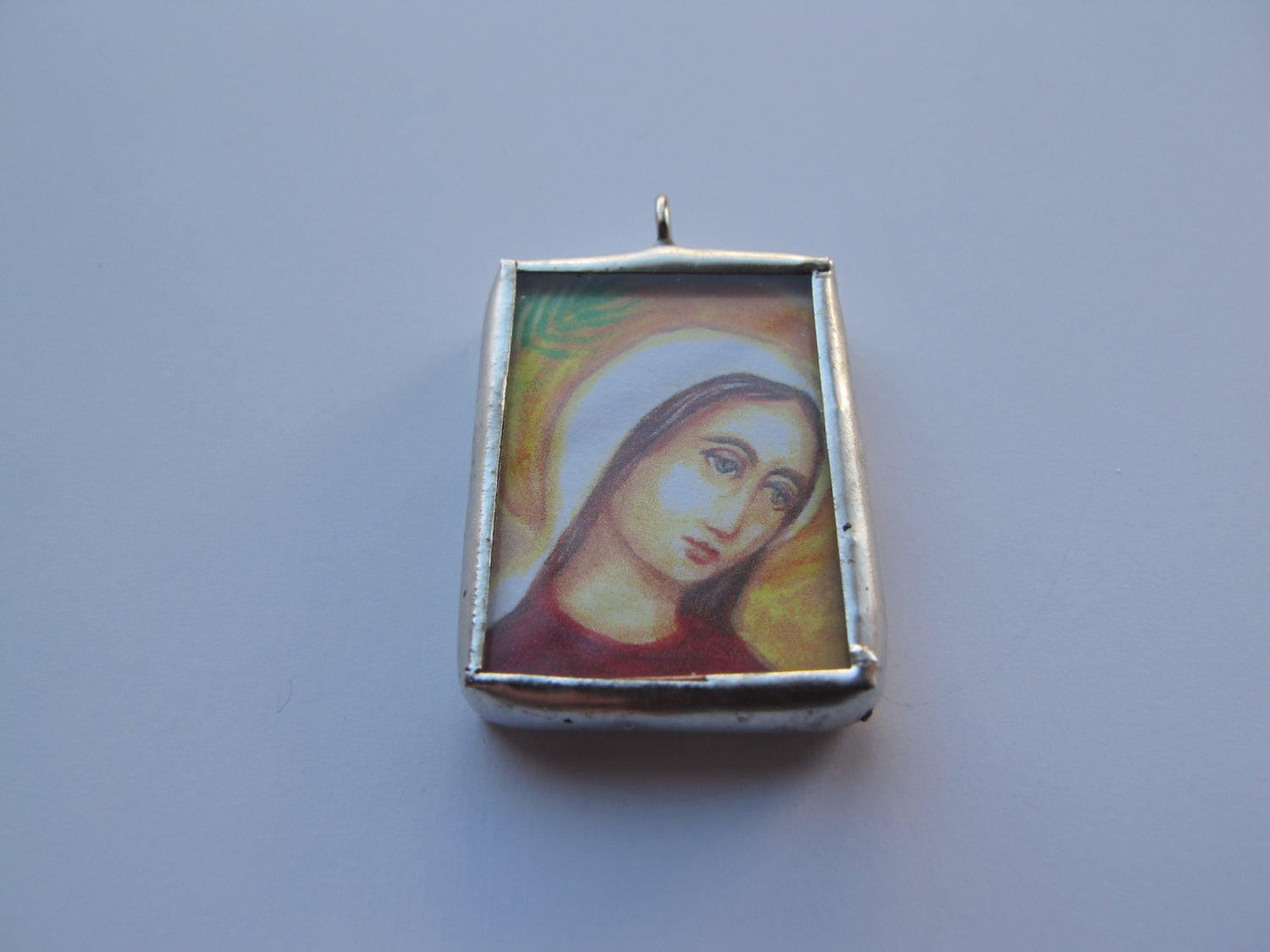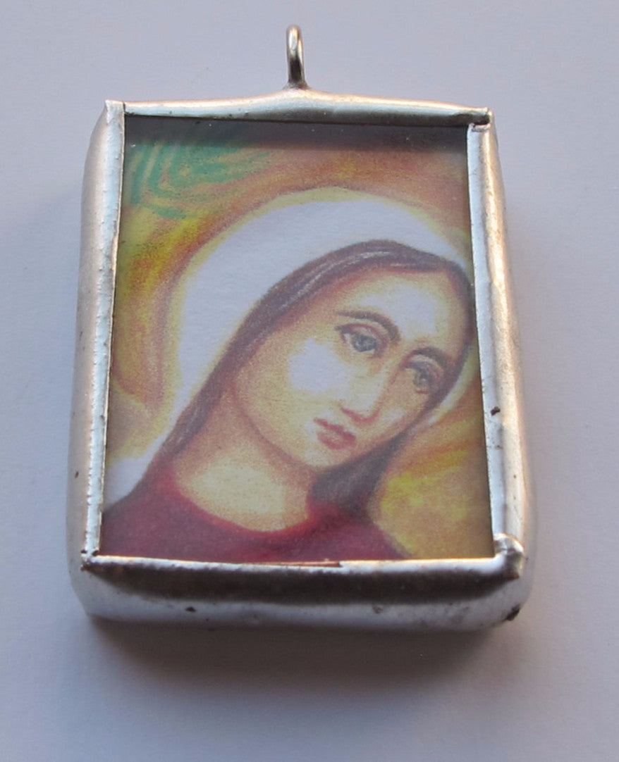 I painted the original with acrylics and colored pencils. The medal is a detail of that painting, which portrays Saint Perpetua, who died in the Colosseum with her disciple Saint Felicity in the 3rd Century AD. They both had to give away their babies before being fed to the wild animals in their total surrender to Christ. The palm branch in the background symbolizes martyrdom.