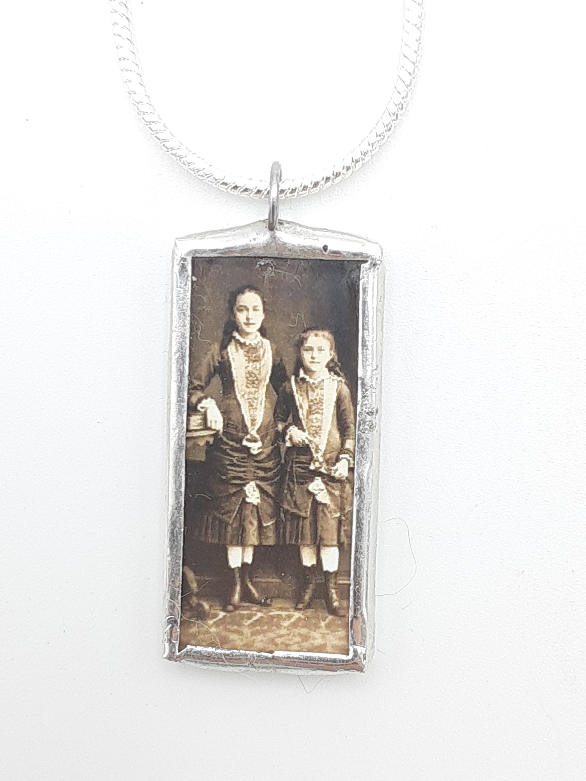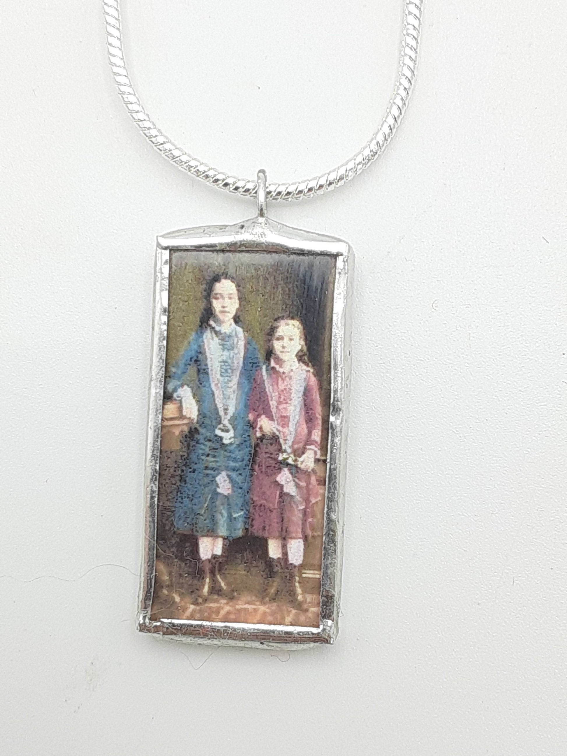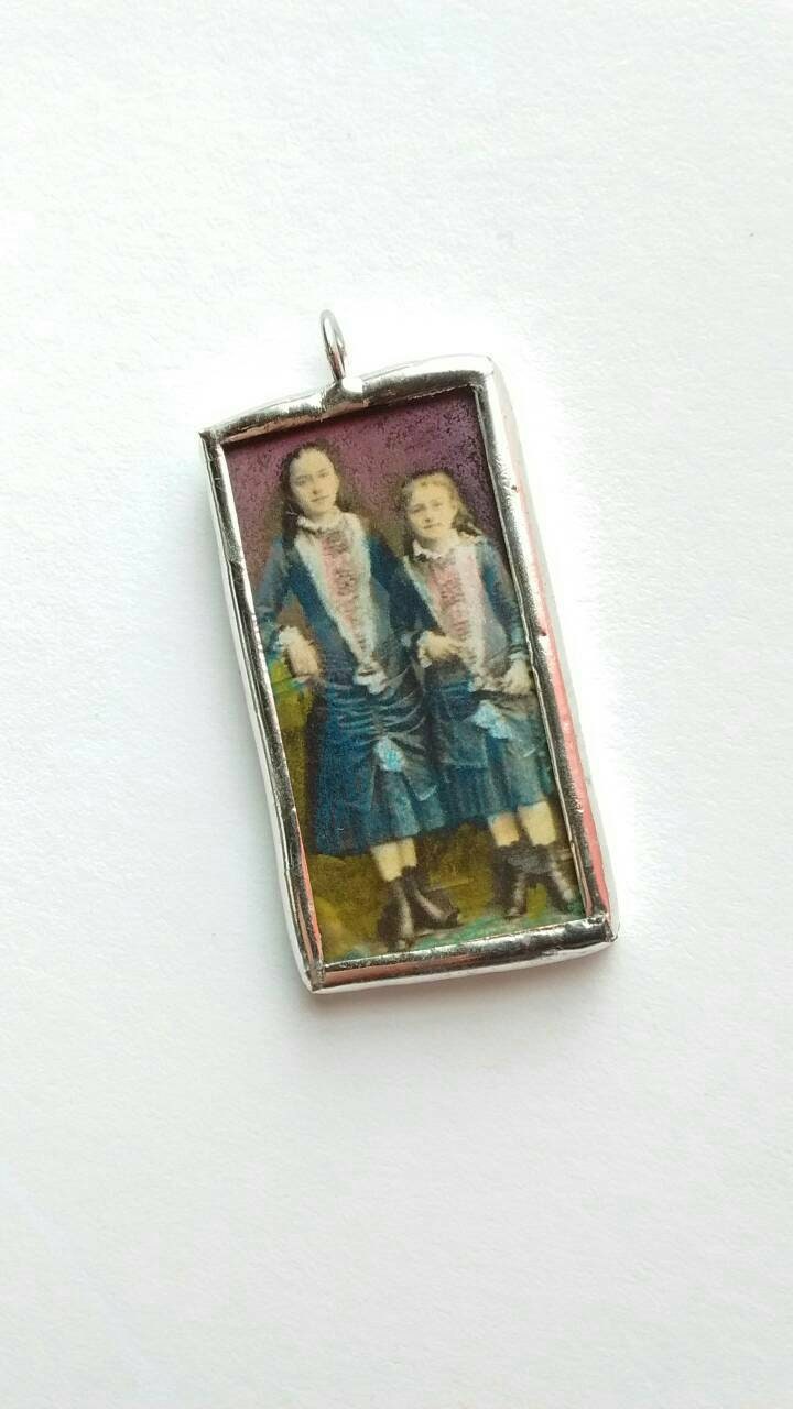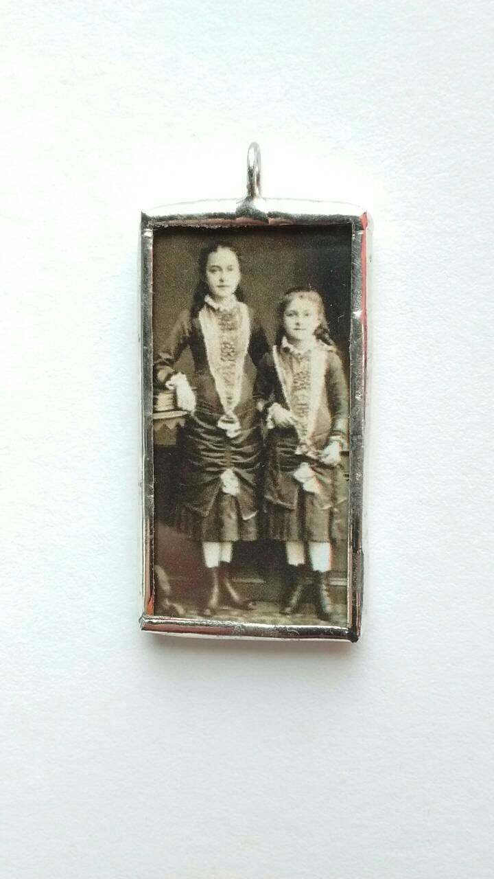 Pendant/medal of a photograph of Saint Therese and her sister Celine. I've touched it up with a bit of color on one side. The other side is the original sepia tone color. Made with lead free solder.