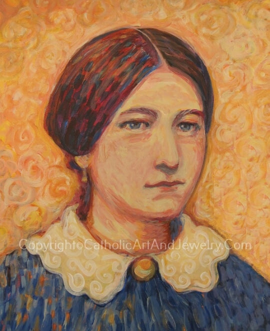This painting was done with reference to a photo of a fairly recent saint, well-loved by many in the Catholic Church, Saint Theresa of Lisieux, or "The Little Flower." She lived and died at the end of the nineteenth century as a girl, really. She was only 24 when she died, as a Carmelite nun. During her last illness she was ordered to write her story, which she called The Story of a Soul. It spells out her simple spirituality, the way of littleness, or spiritual childhood. That is why Sue wanted to portray her as a child.