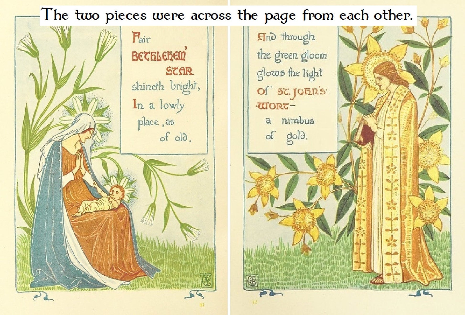 This delightful, whimsical little piece comes from A Floral Fantasy in an Old English Garden, an 1899 book by Walter Crane, one of the top illustrators of his day. The book was described as telling of the hidden life and society of flowers. Each picture had a little poem. We like how the piece is lighthearted and yet reverent, showing the flower as an emblem of the Evangelist.