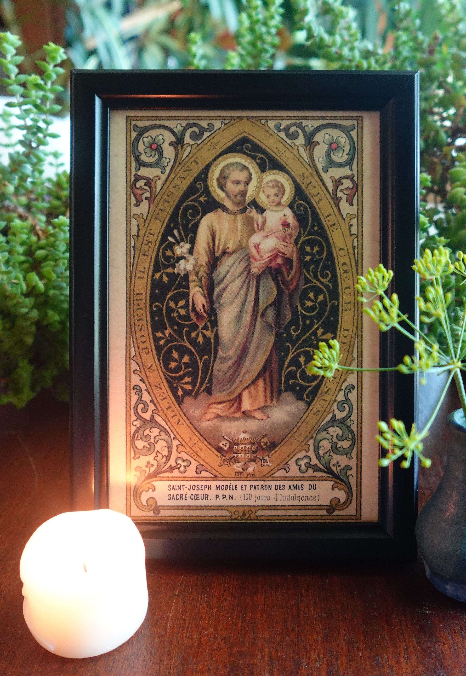 In this French Victorian holy card, Joseph is holding the baby Jesus, who is holding his Sacred Heart. This is very rare in Catholic art to get these two powerful Icons in this same image: St. Joseph and The Sacred Heart. The colors are rich and warm, but still have some of that vintage feel. We love this card and think it is beautiful! This is a companion to Our Lady of the Sacred Heart, printed by the same company.