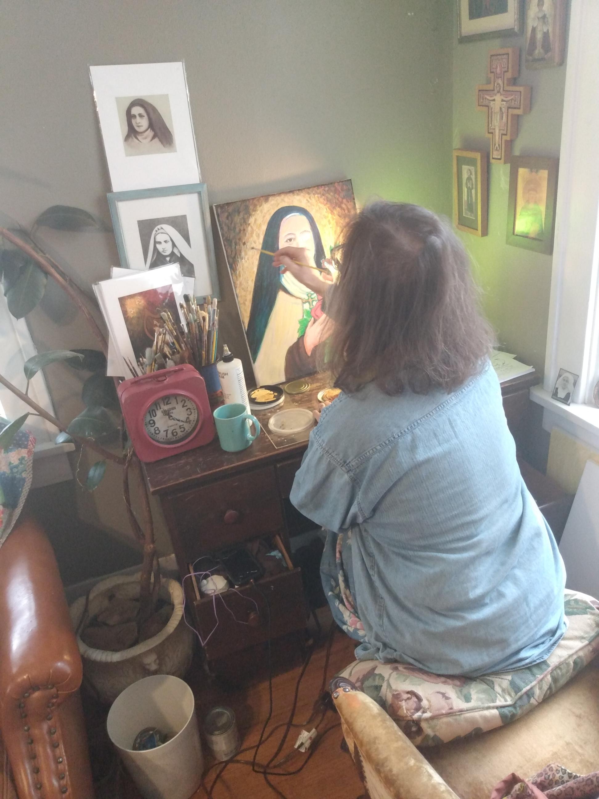 Here's my latest painting of my friend St. Therese of Lisieux. I try to imagine I'm with my Saints when I paint them, and with Therese, I get the feeling she is looking back at me with warm love. I used the classic icon pose for her and added my own touches. The falling rose petals are part of her shower of roses on us. Ask her for some! She loves to make friends!