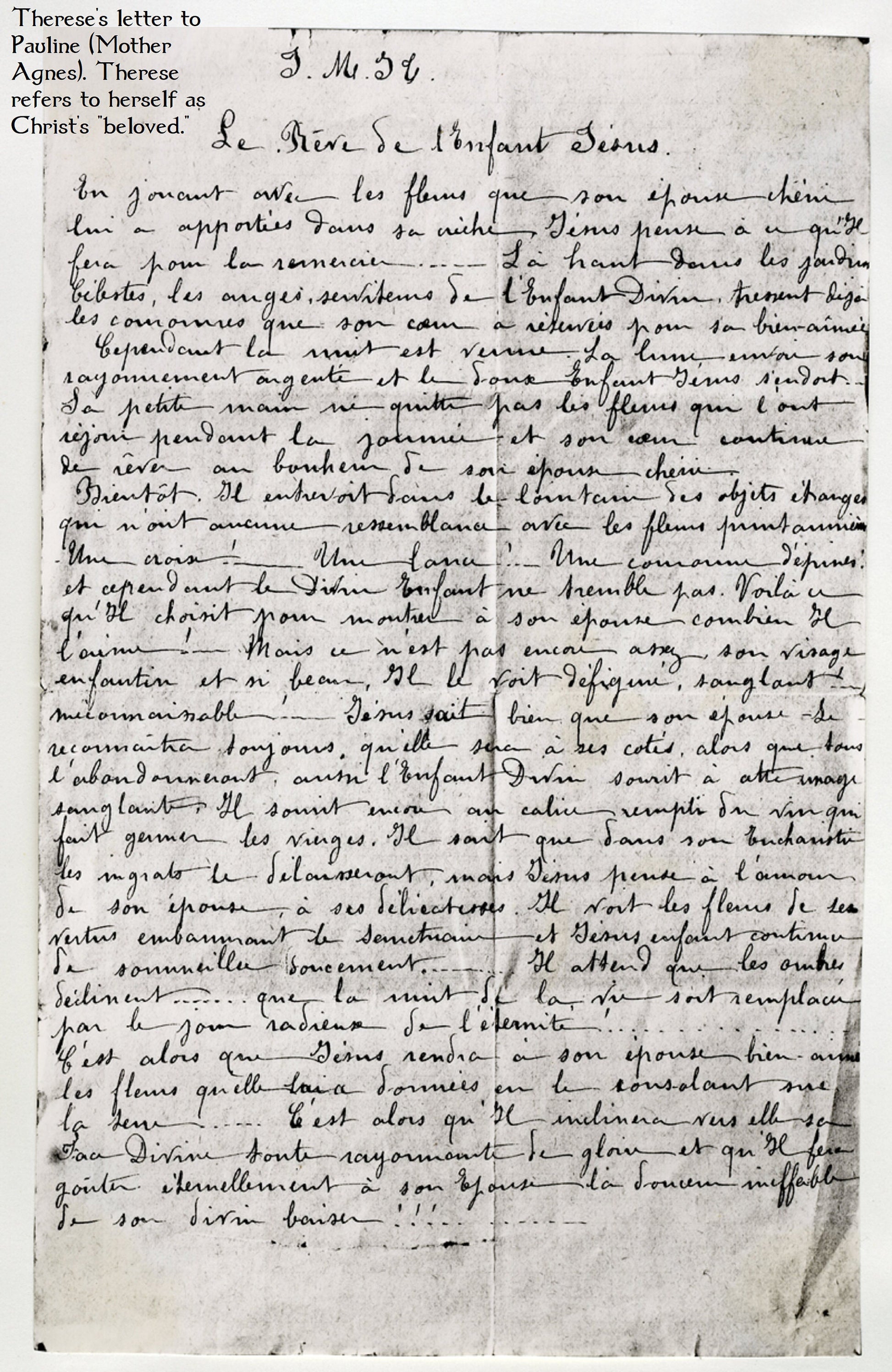 You have just read the dream that your child wanted to reproduce for your feast day. But, alas! only your artistic brush could paint such a sweet mystery!... I trust you will look only upon the good will of her who would be happy to please you...." (the rest of the letter can be found as Letter 156 at www.archives-carmel-lisieux.fr)