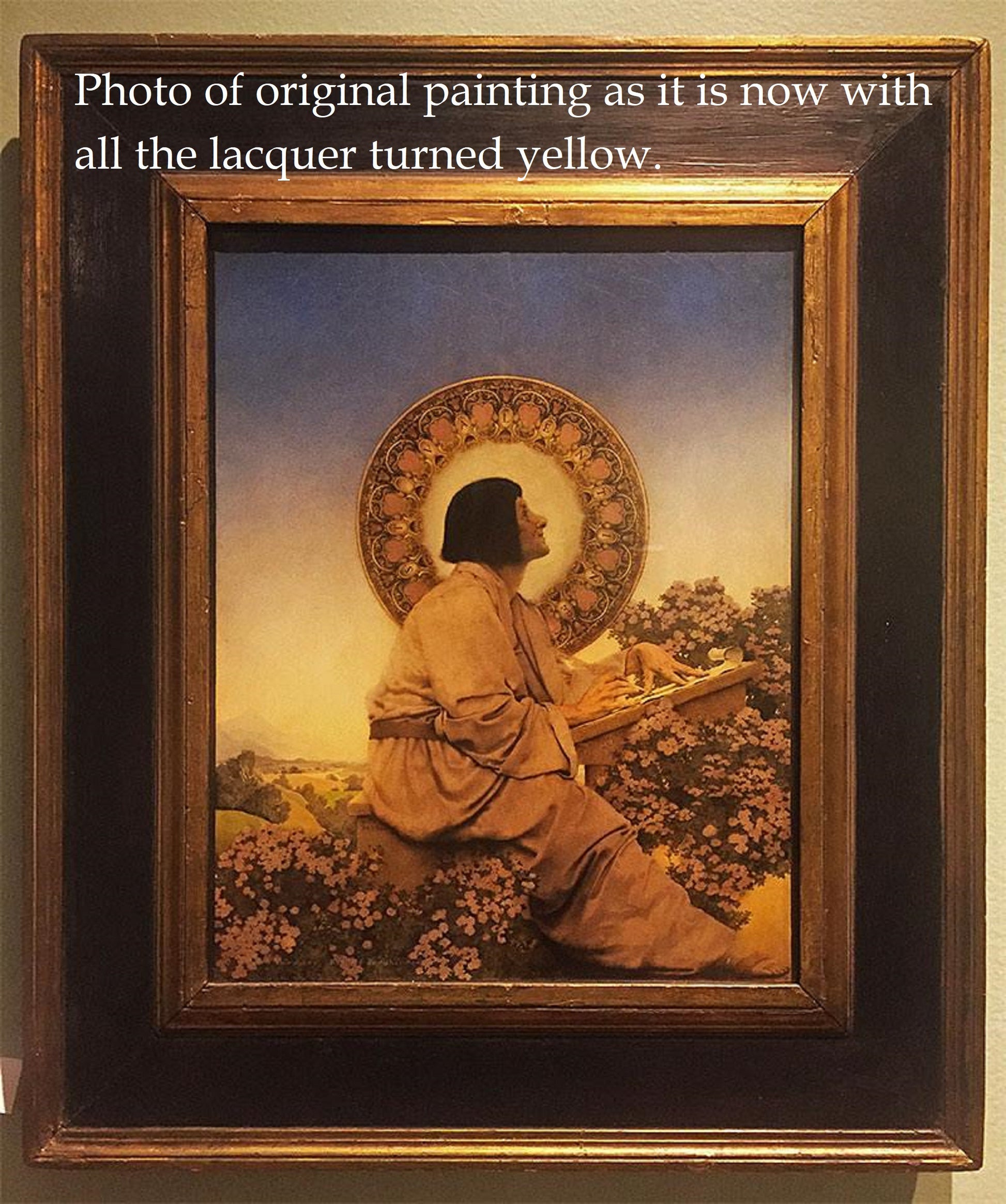 Parrish typically made his paintings with many layers of lacquer and paint. This made the colors pop and seemed to make the light sources shine of their own accord. But the paintings do not age well. (See example.) The lacquer turns yellow and the paintings get so they look like they are encased in amber.