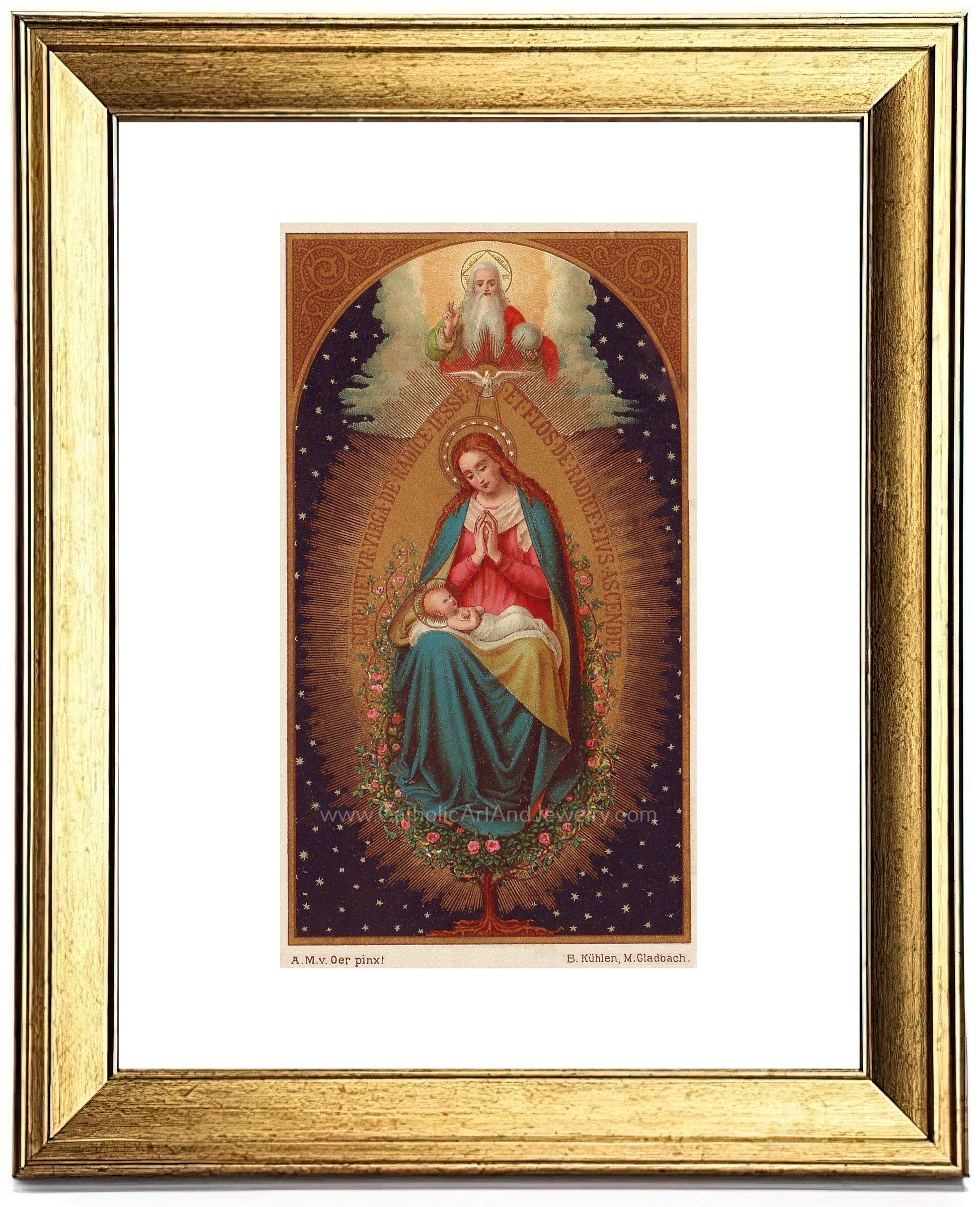 Beautiful and theological, this cosmic German holy card from the late 19th Century has Mary with the Holy Trinity. Mary and the baby Jesus are bordered by a Latin inscription which reads, Egredietur virga de radice Iesse et flos de radice eius ascendet. It is Isaiah 11:1 and means, A shoot will spring from the tree of Jesse, a new shoot will grow from his roots.