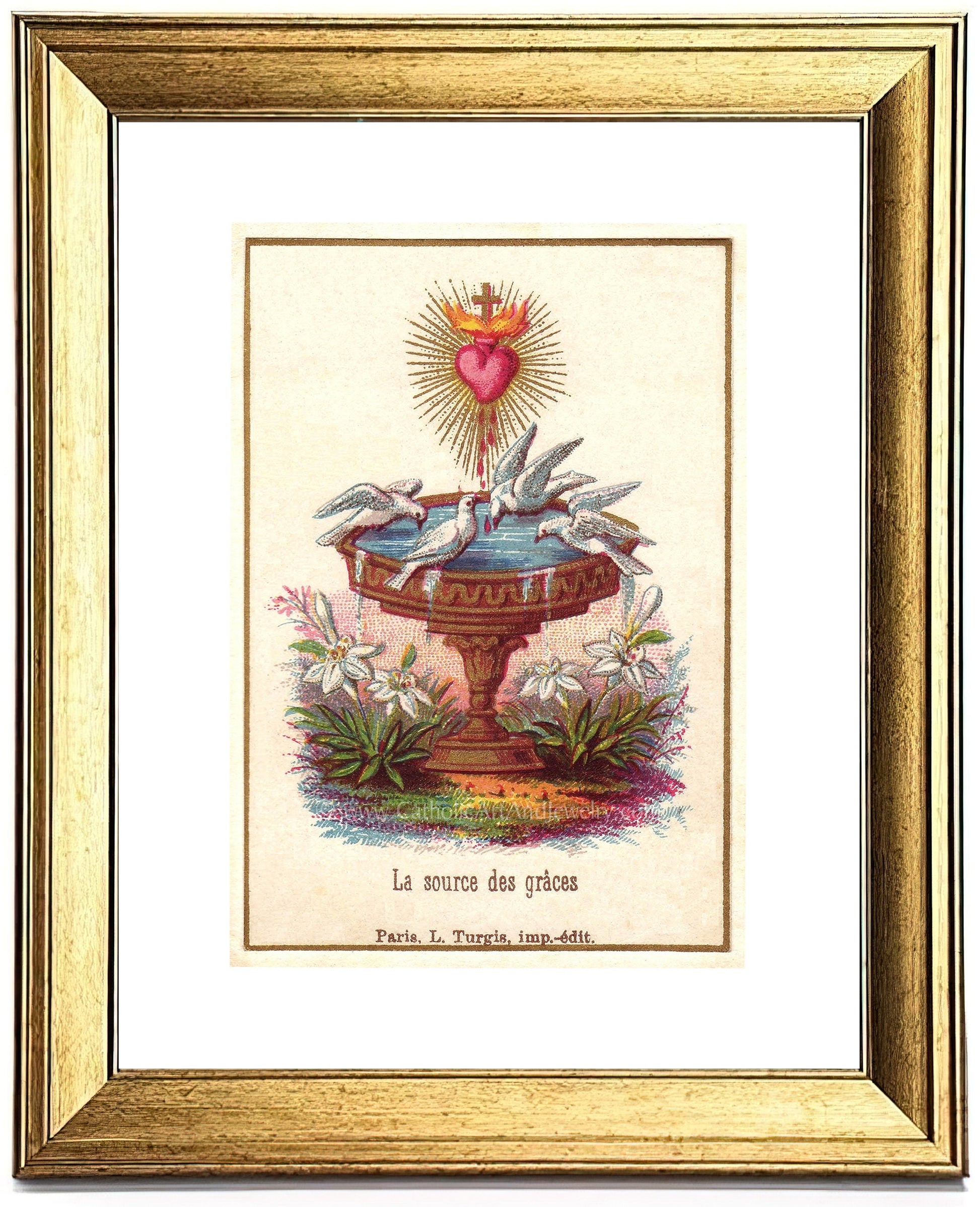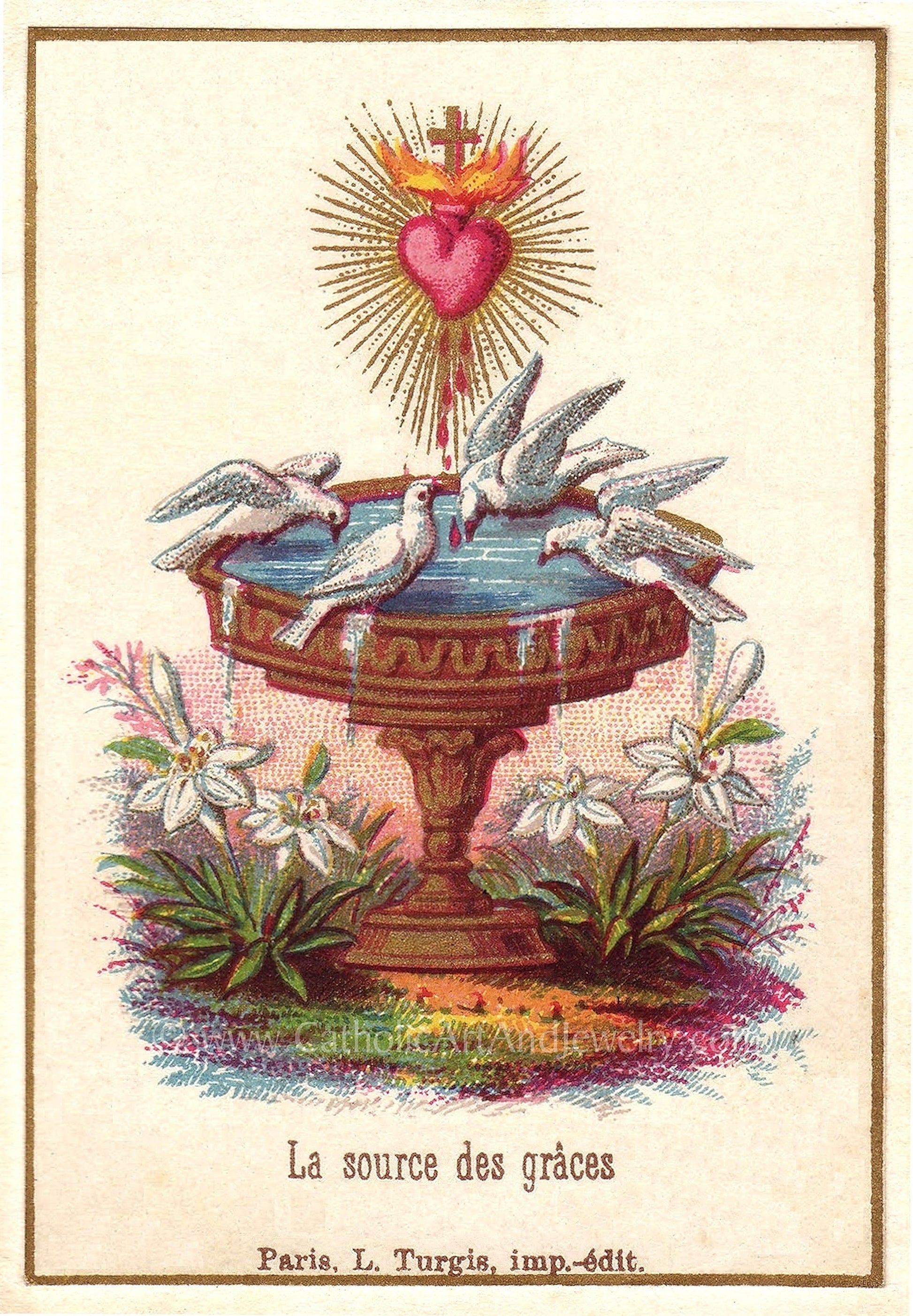 This print, entitled " The Source of Graces," is a beautiful symbol of how Christ satisfies the thirsty soul. Doves were often used in antique art to depict souls. When Christ's Heart was pierced on the Cross, blood and water flowed out, symbolizing the Eucharist and the forgiveness found in Baptism and the sacrament of Reconciliation.